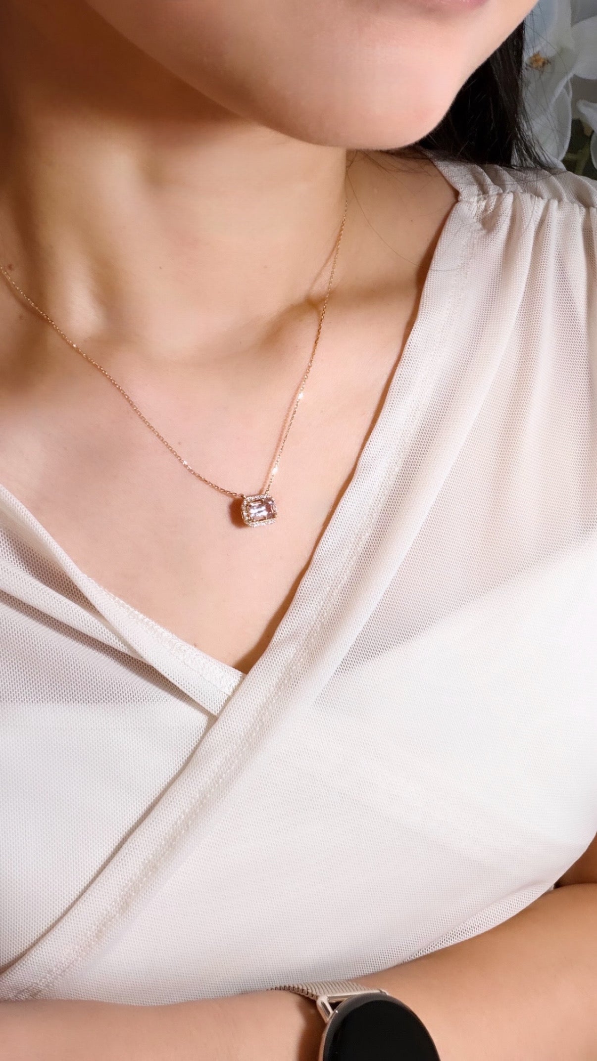 すっきりとした長方形(レクタングル)のシェイプが、ミニマルで、美しいモルガナイトのネックレス。