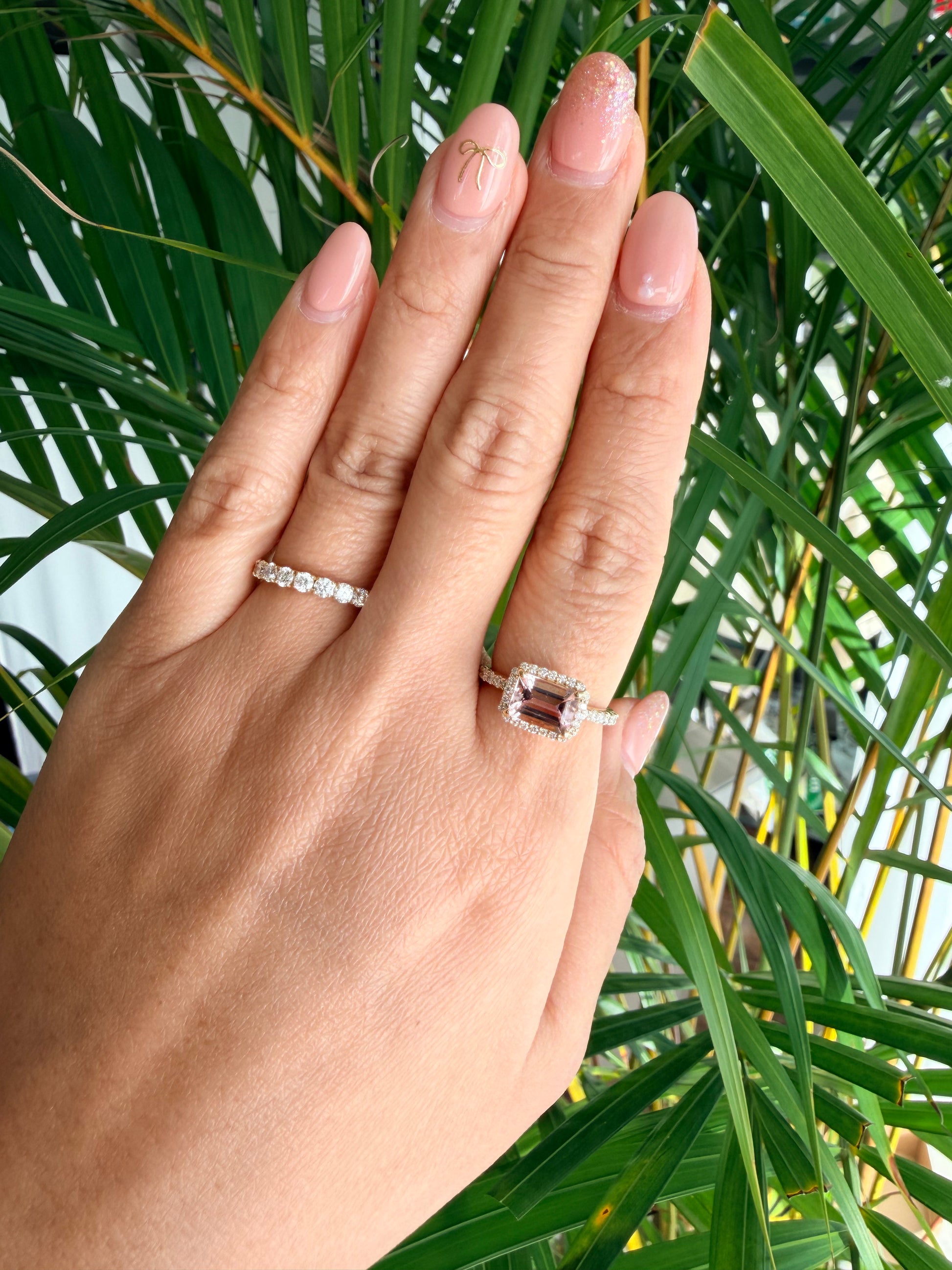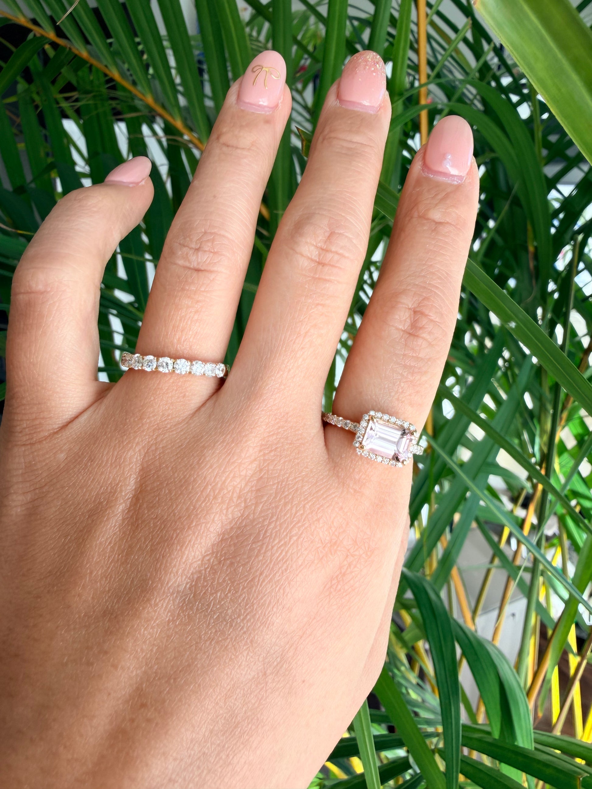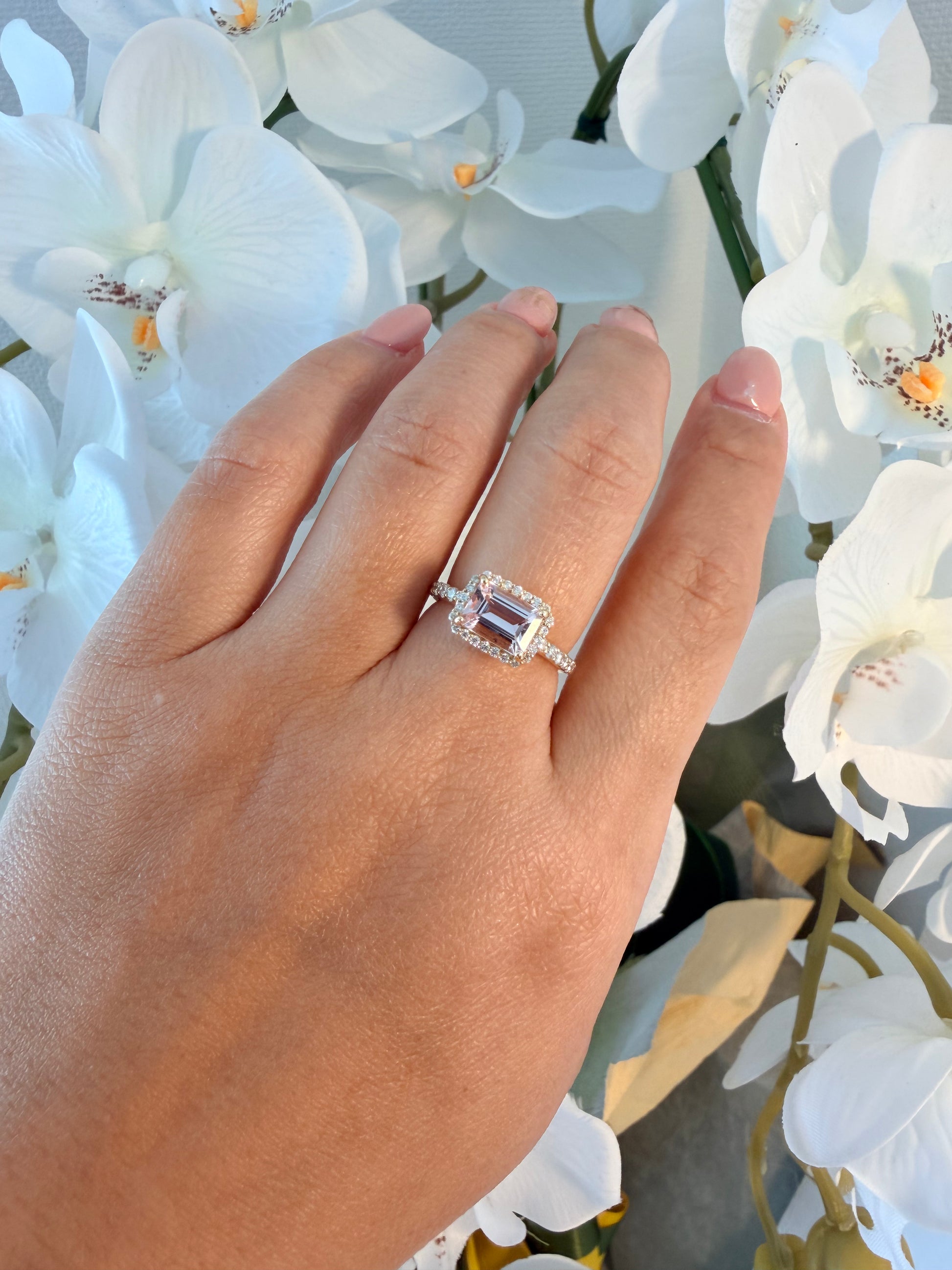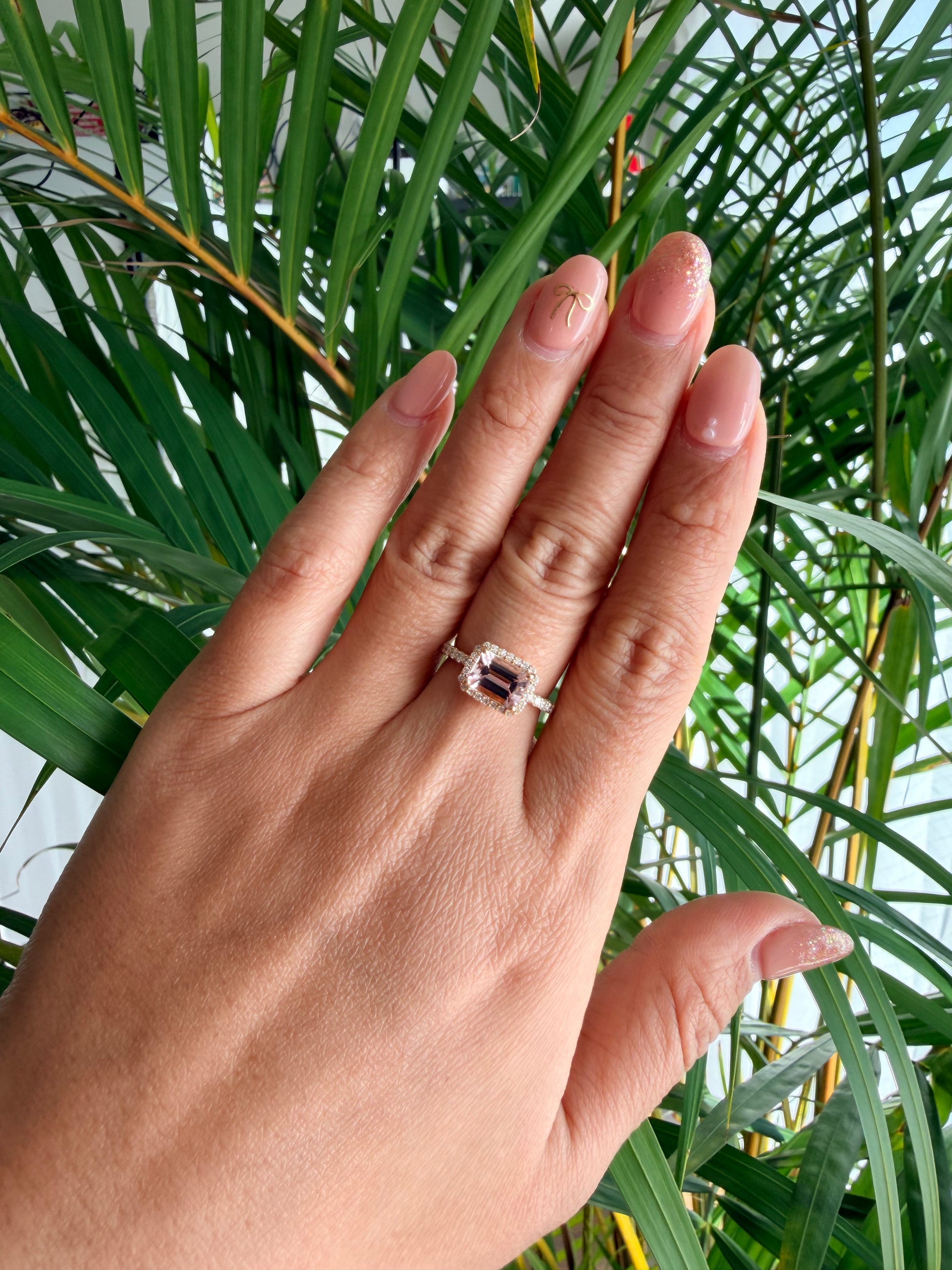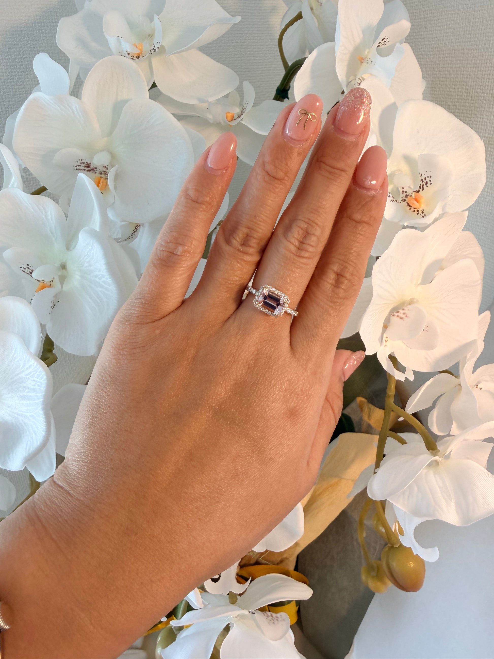 青みがかった桜のようなピンク色の、甘い印象のモルガナイト。
