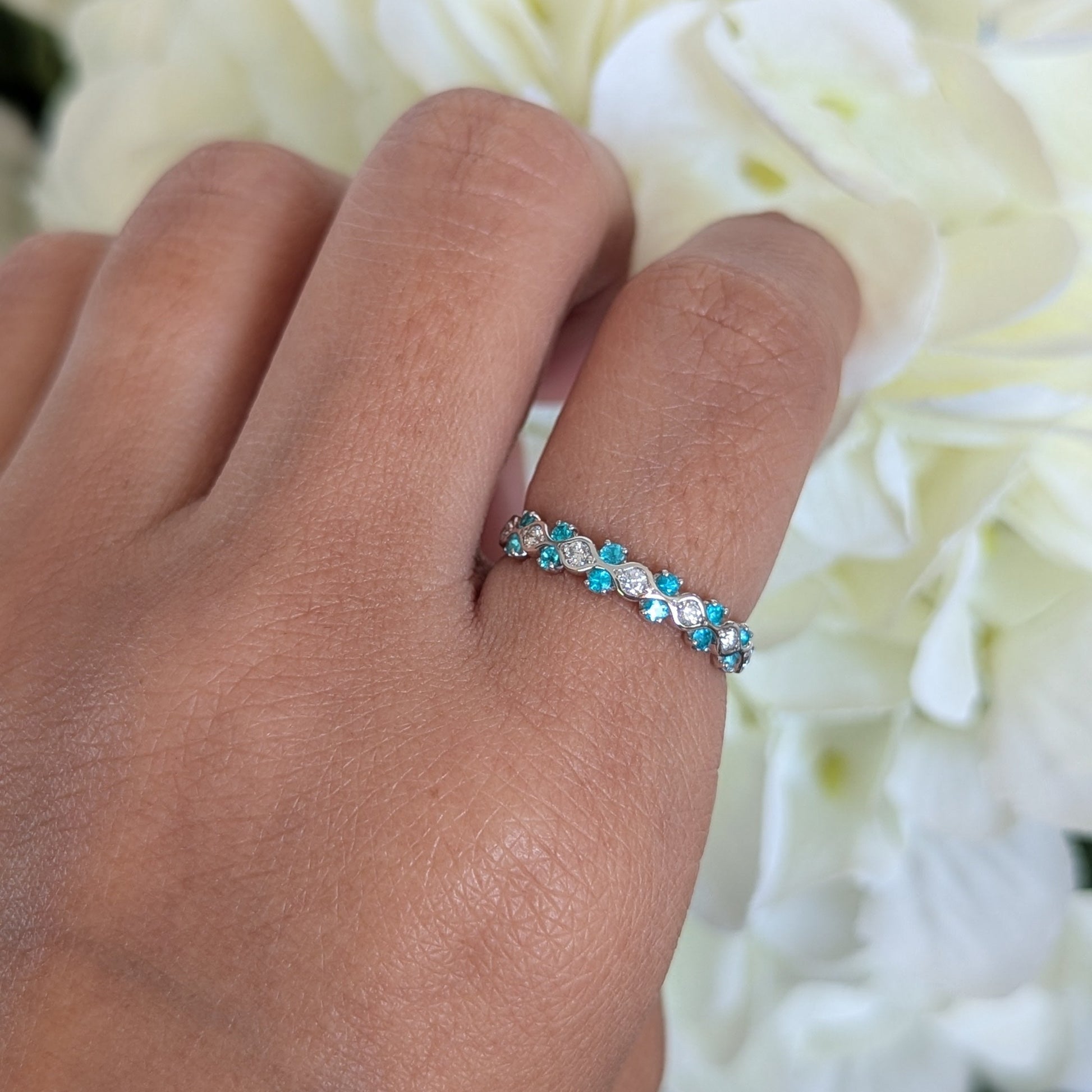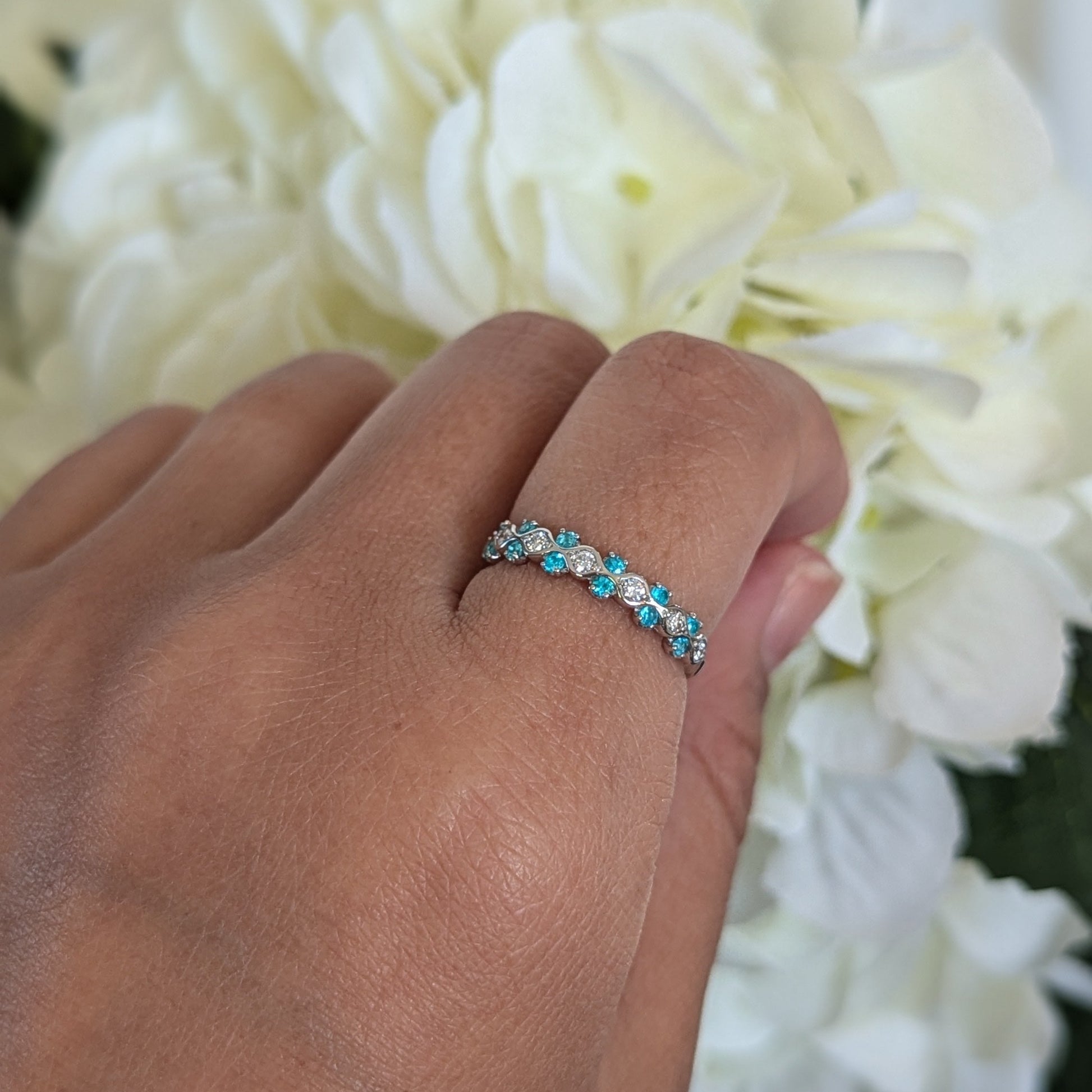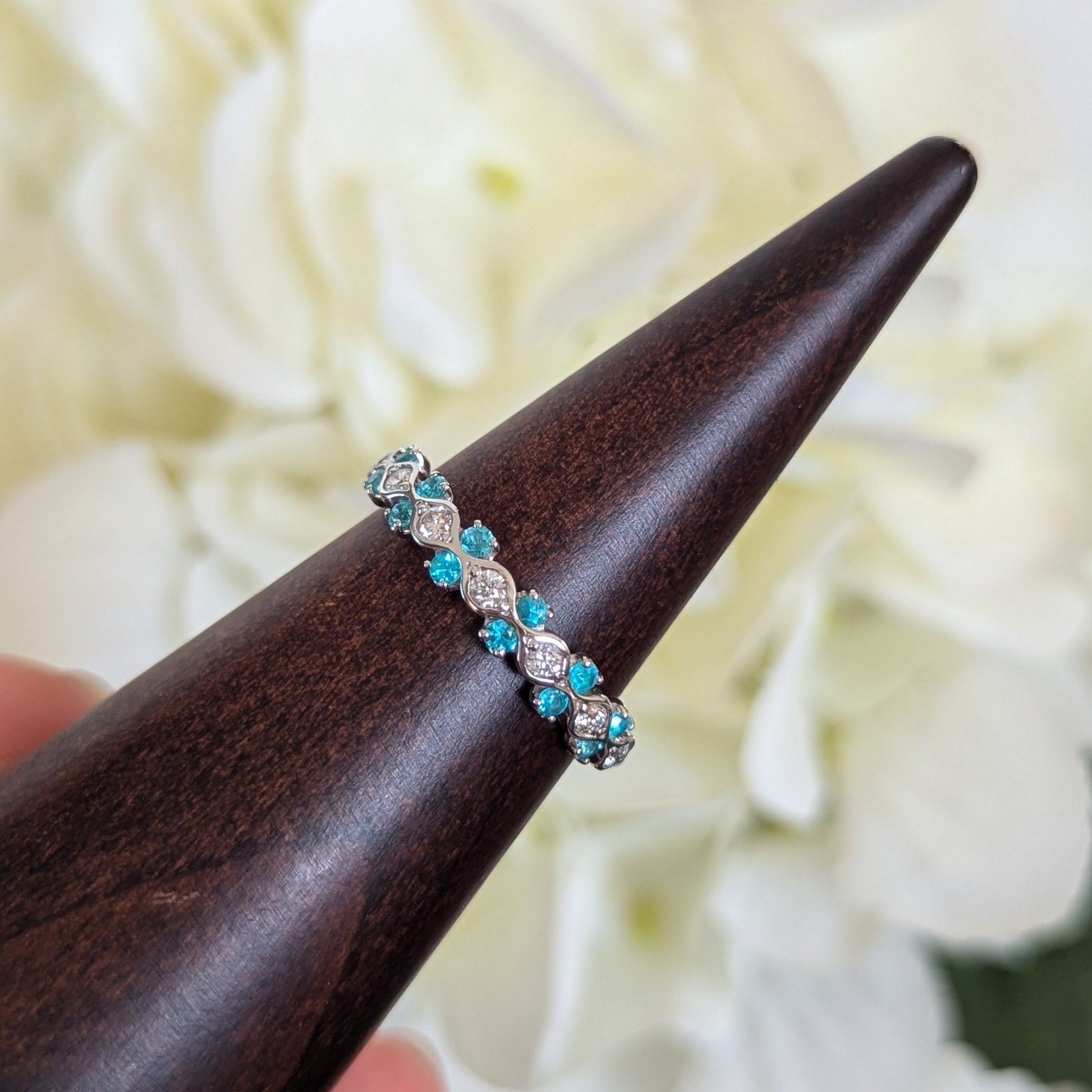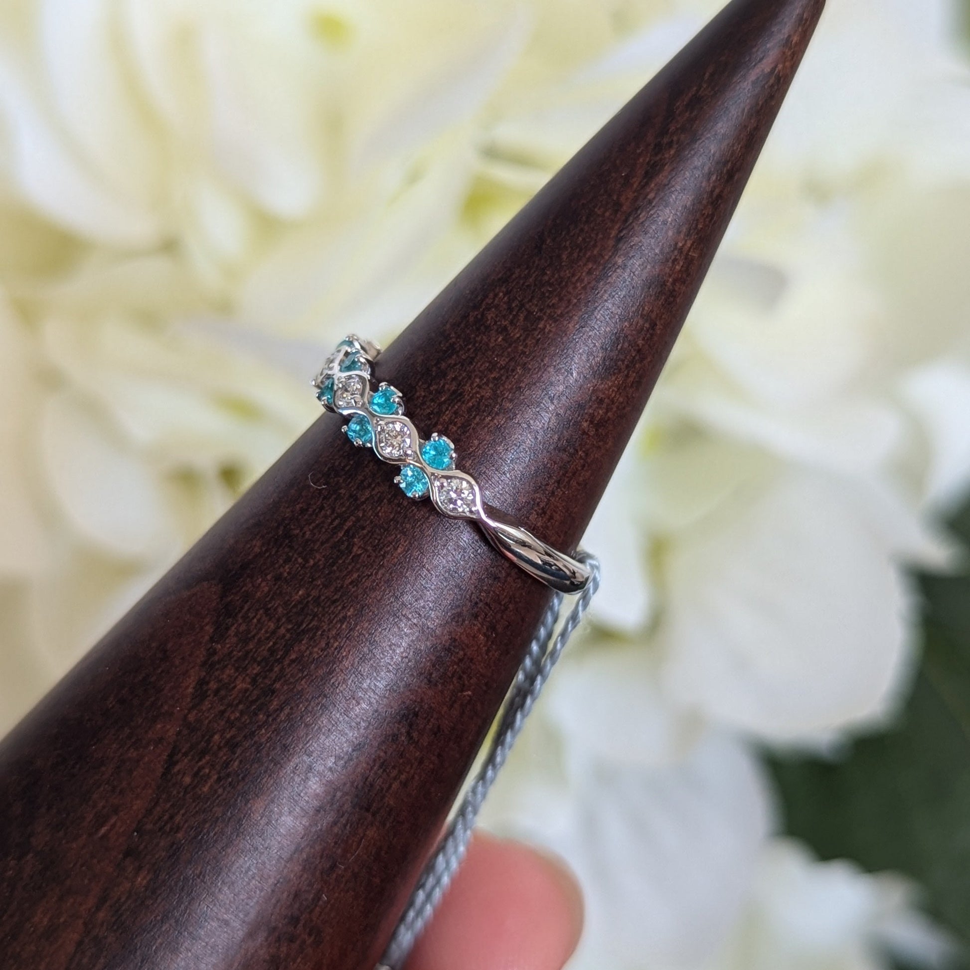 心を明るくしてくれるような爽やかなネオンブルーとダイヤモンドの組み合わせを目で楽しめるリングです。