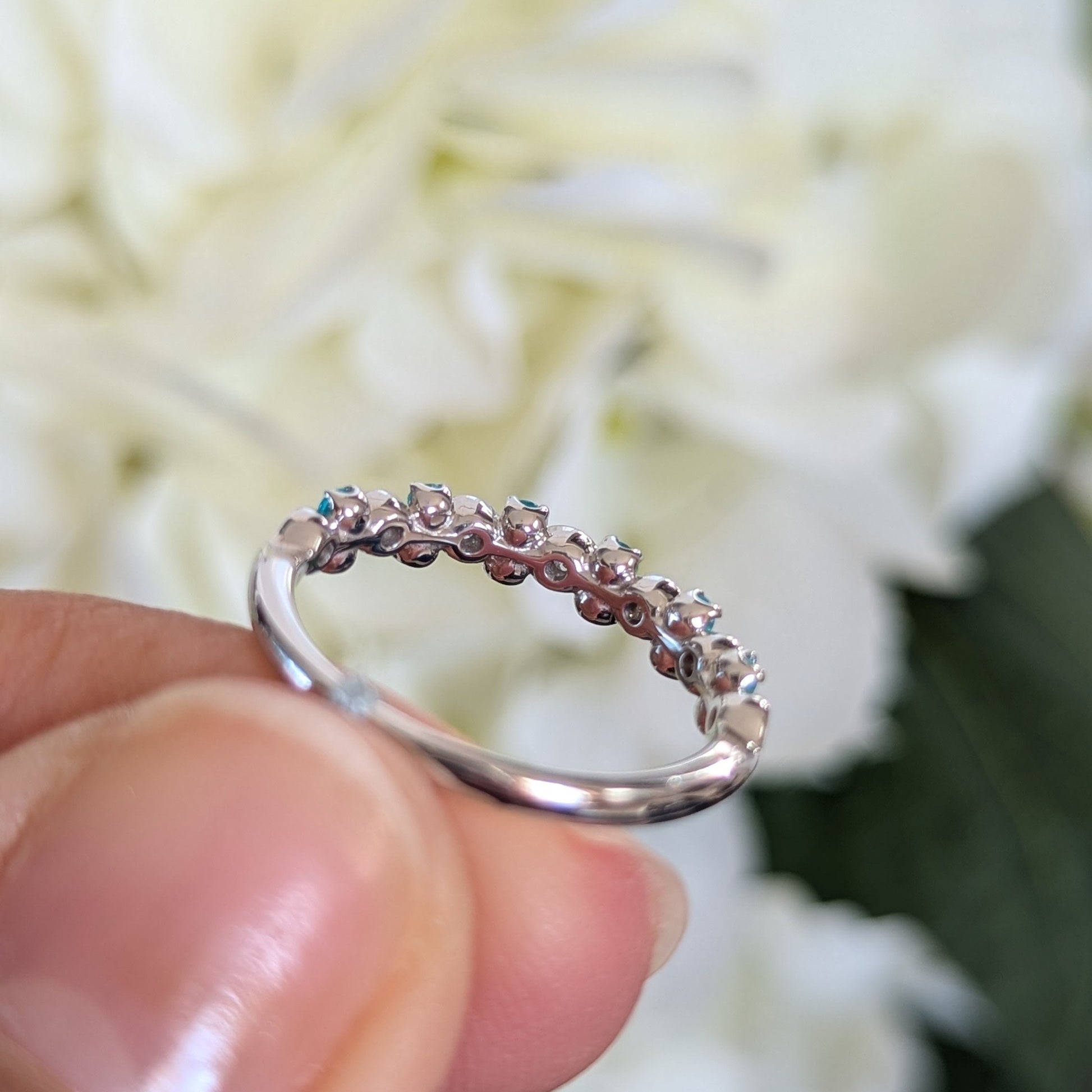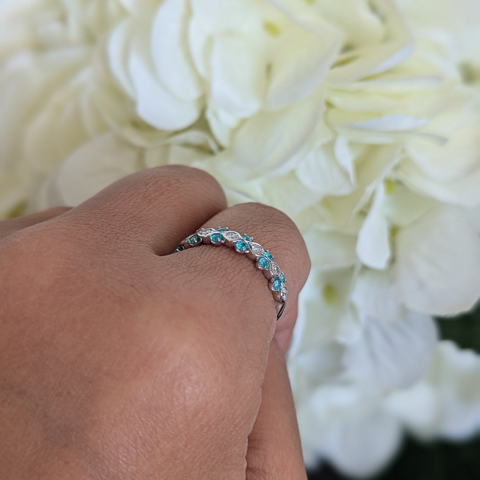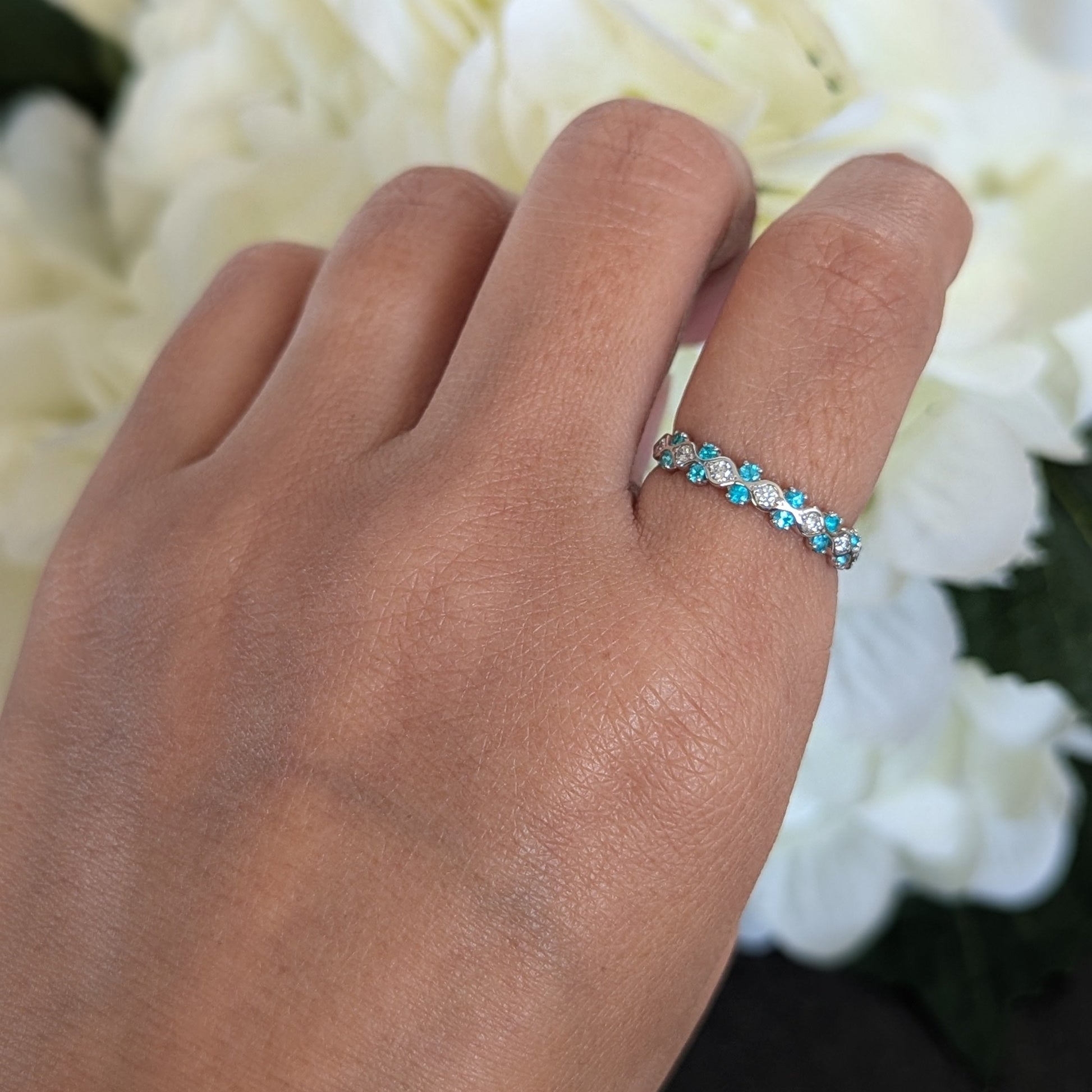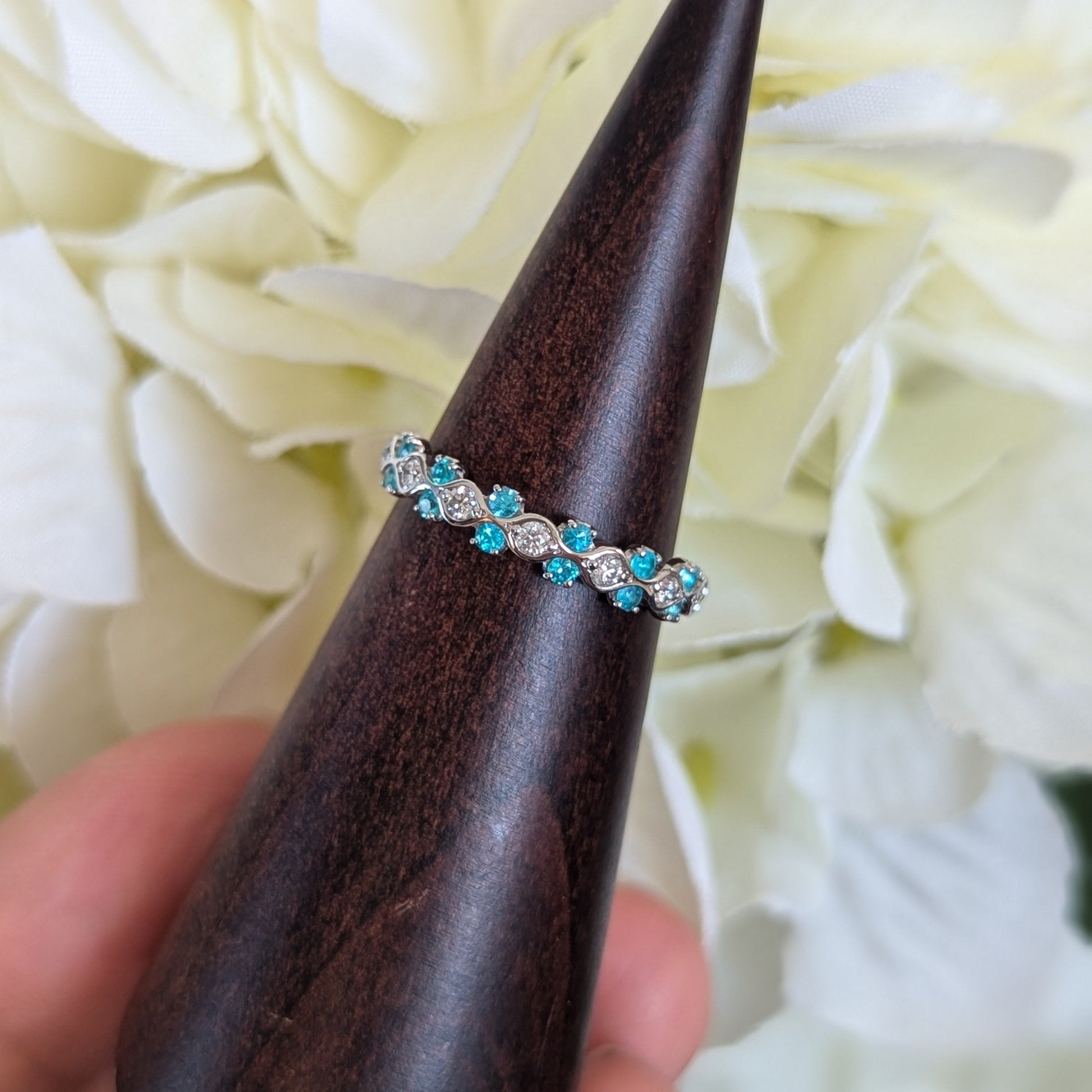 心を明るくしてくれるような爽やかなネオンブルーとダイヤモンドの組み合わせを目で楽しめるリングです。