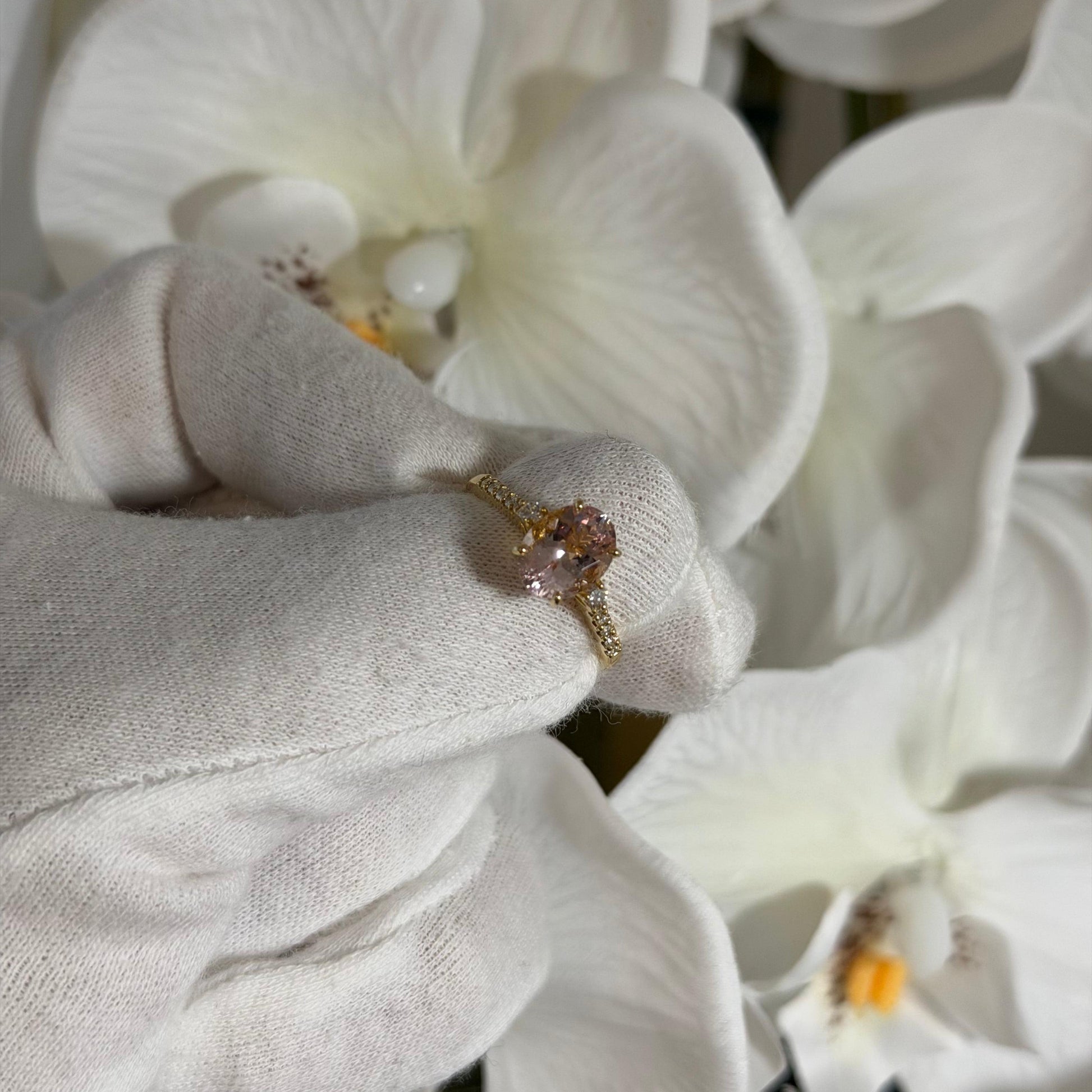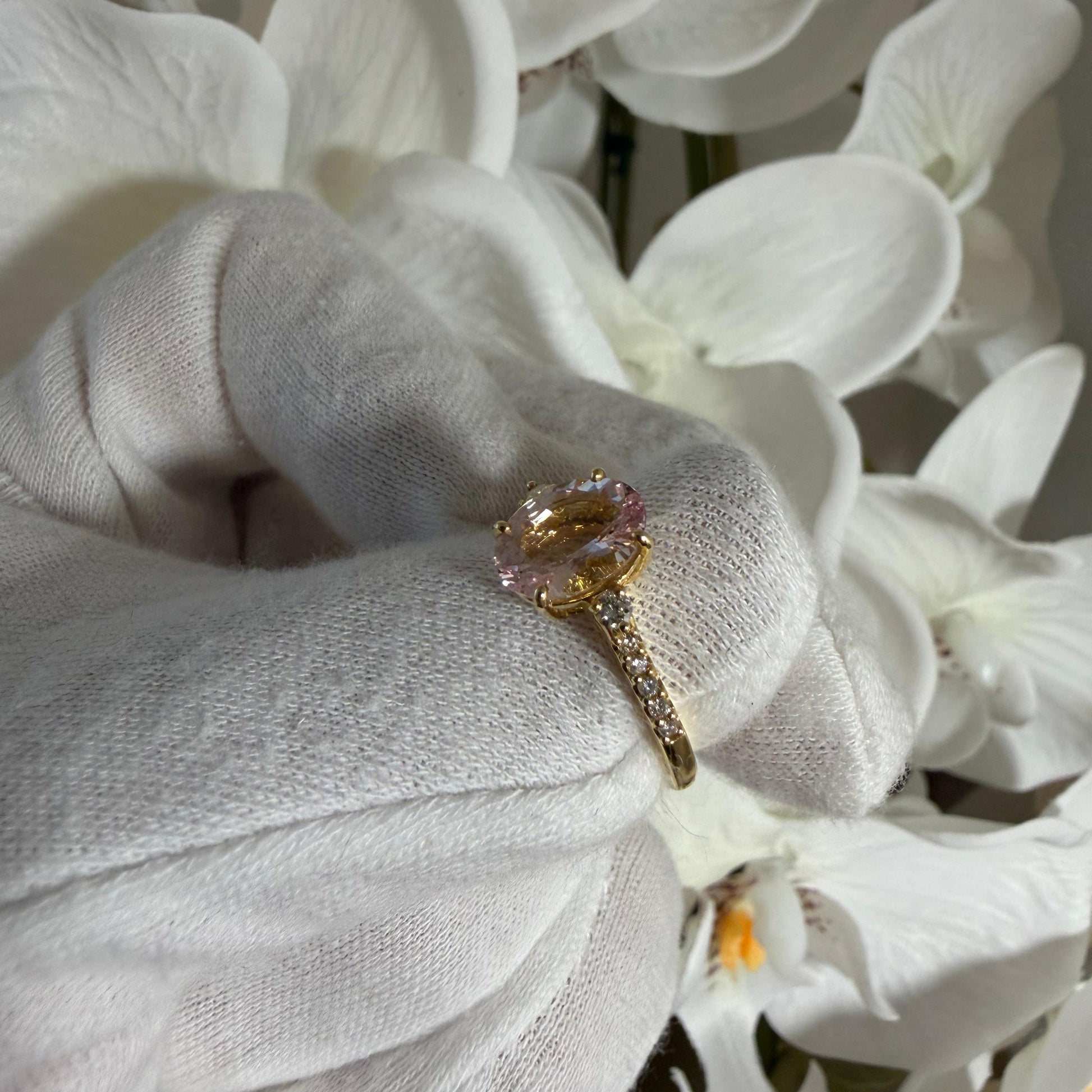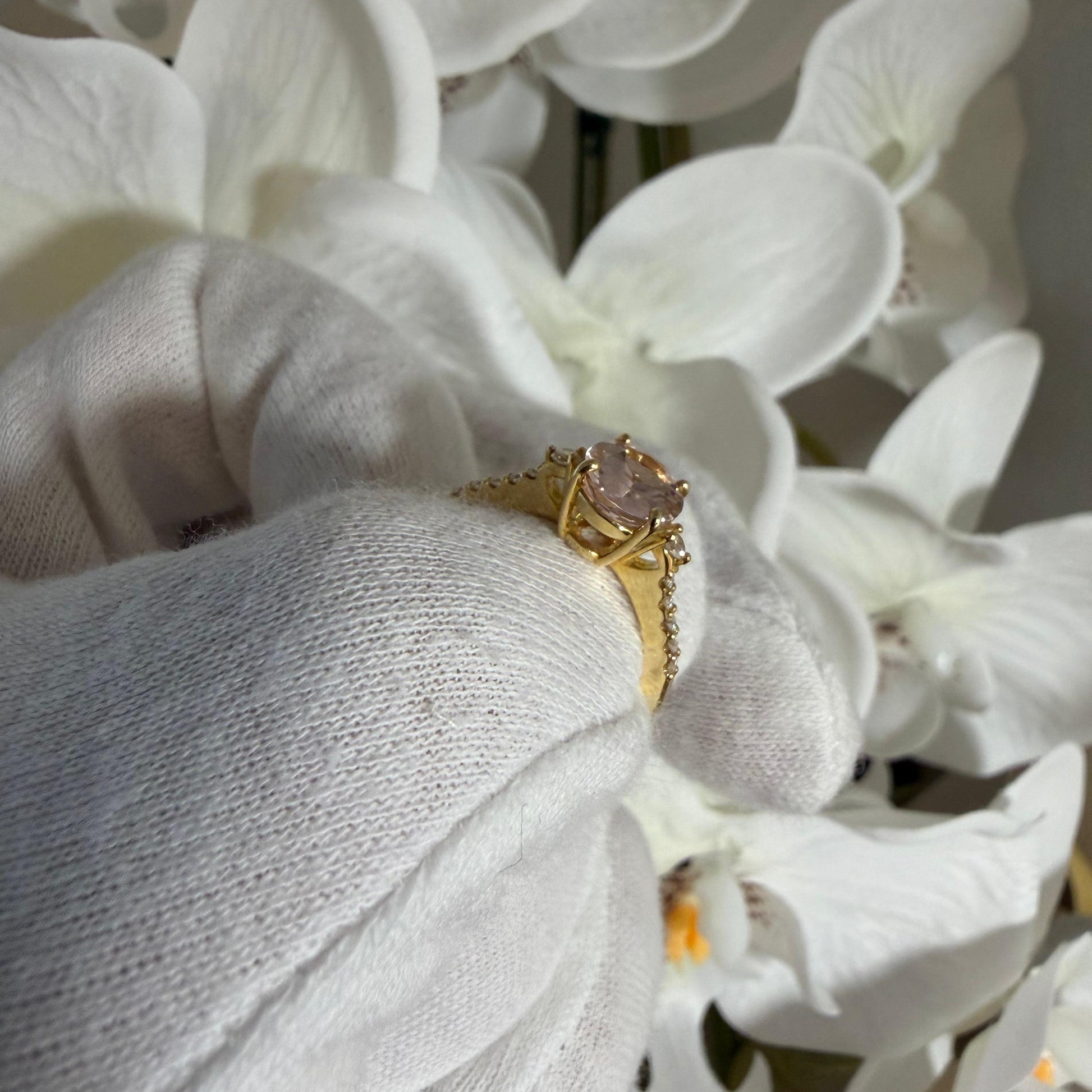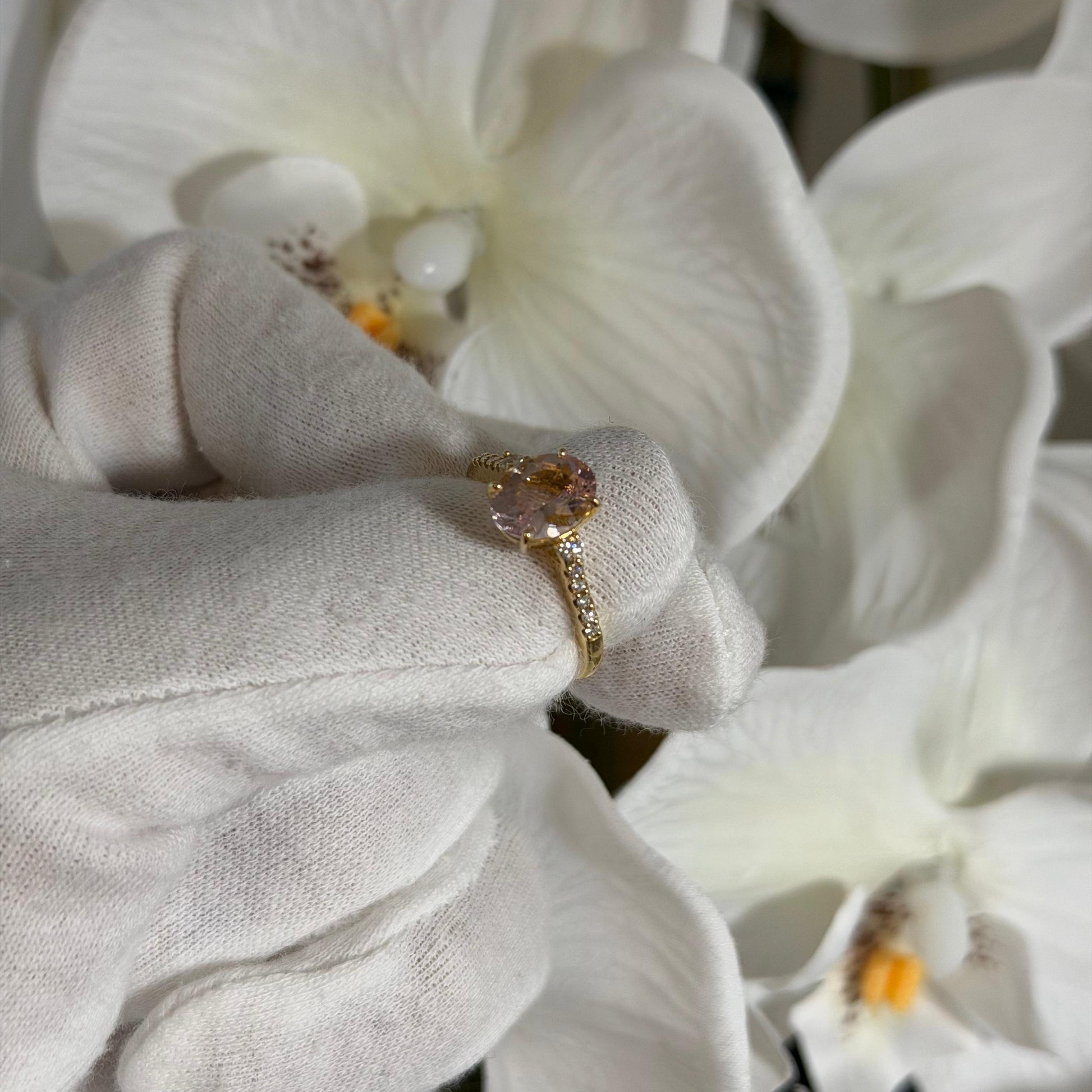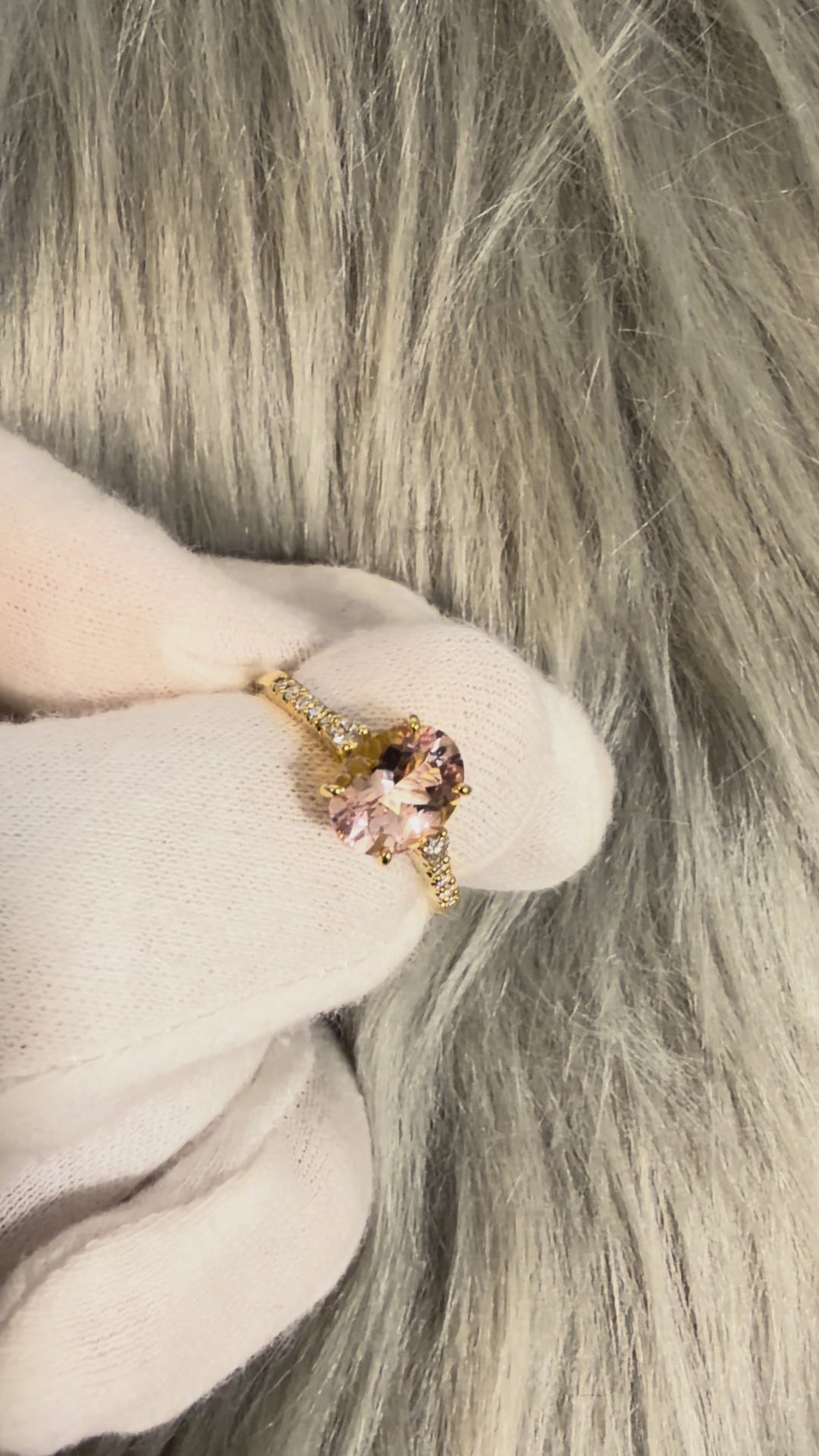 桜色のオーバルシェイプのモルガナイトx細身のアームにダイヤモンドを12石あしらったリング、Dance。