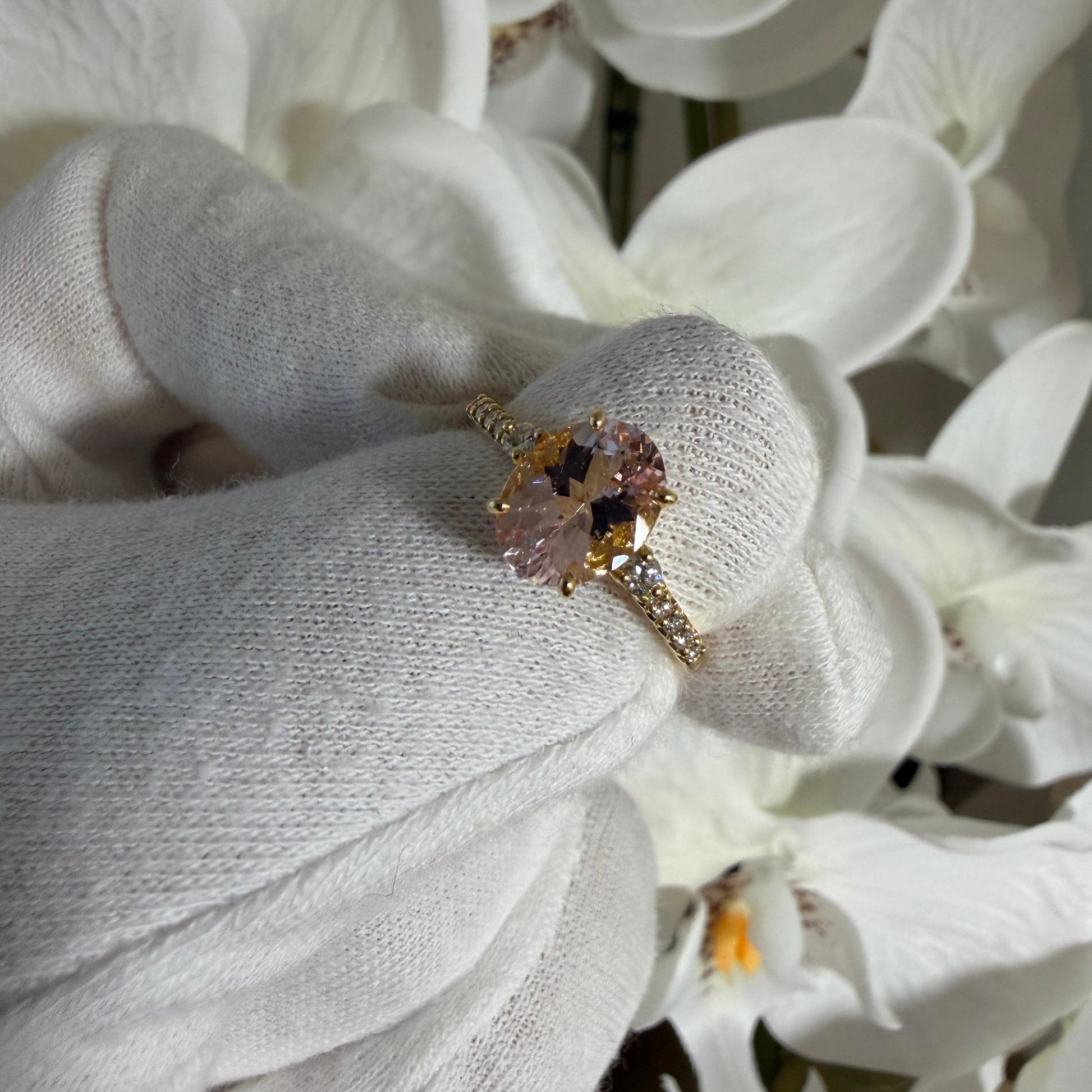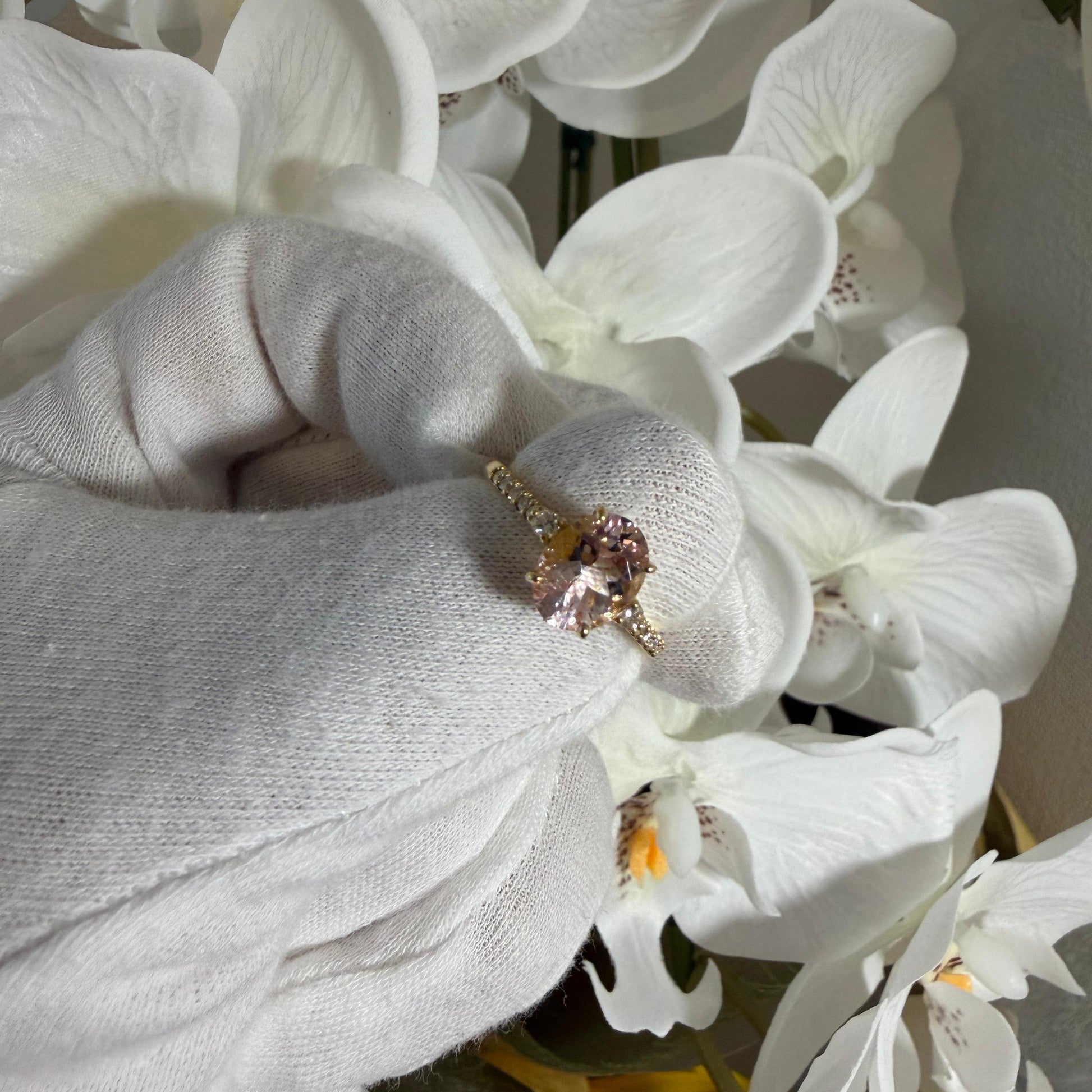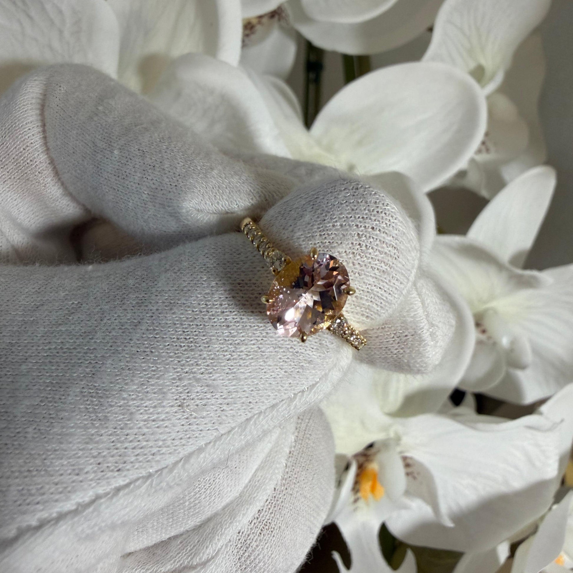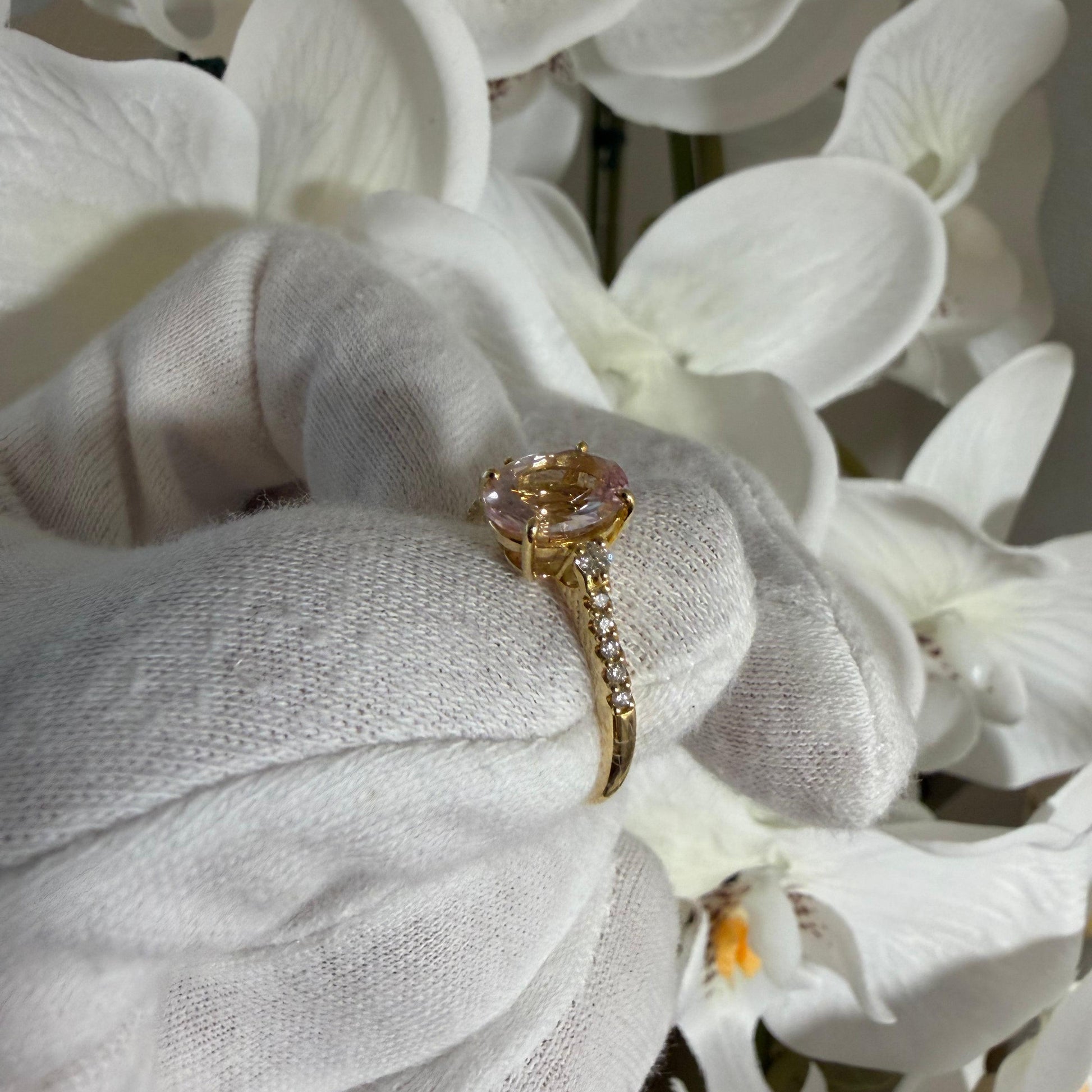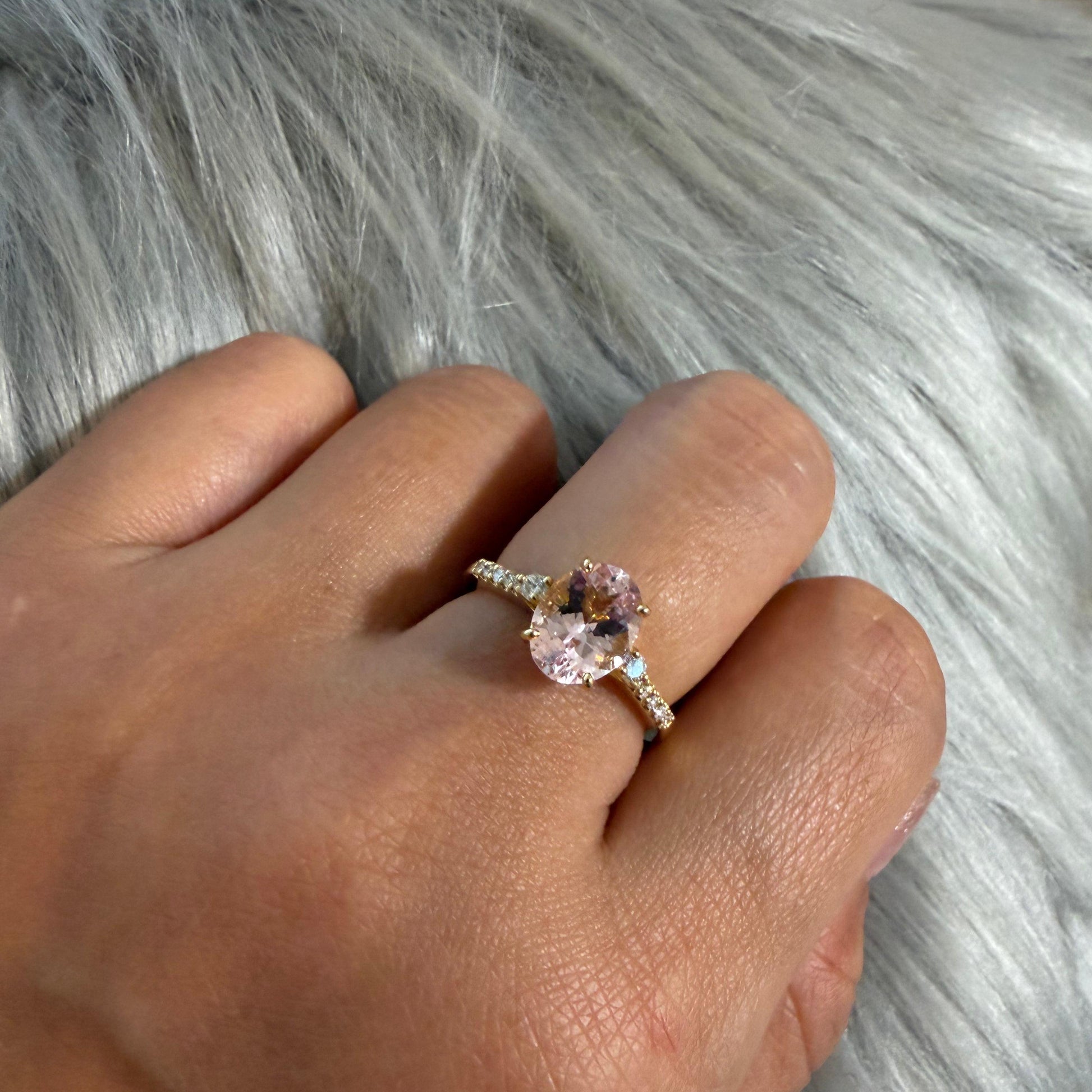 桜色のオーバルシェイプのモルガナイトx細身のアームにダイヤモンドを12石あしらったリング、Dance。