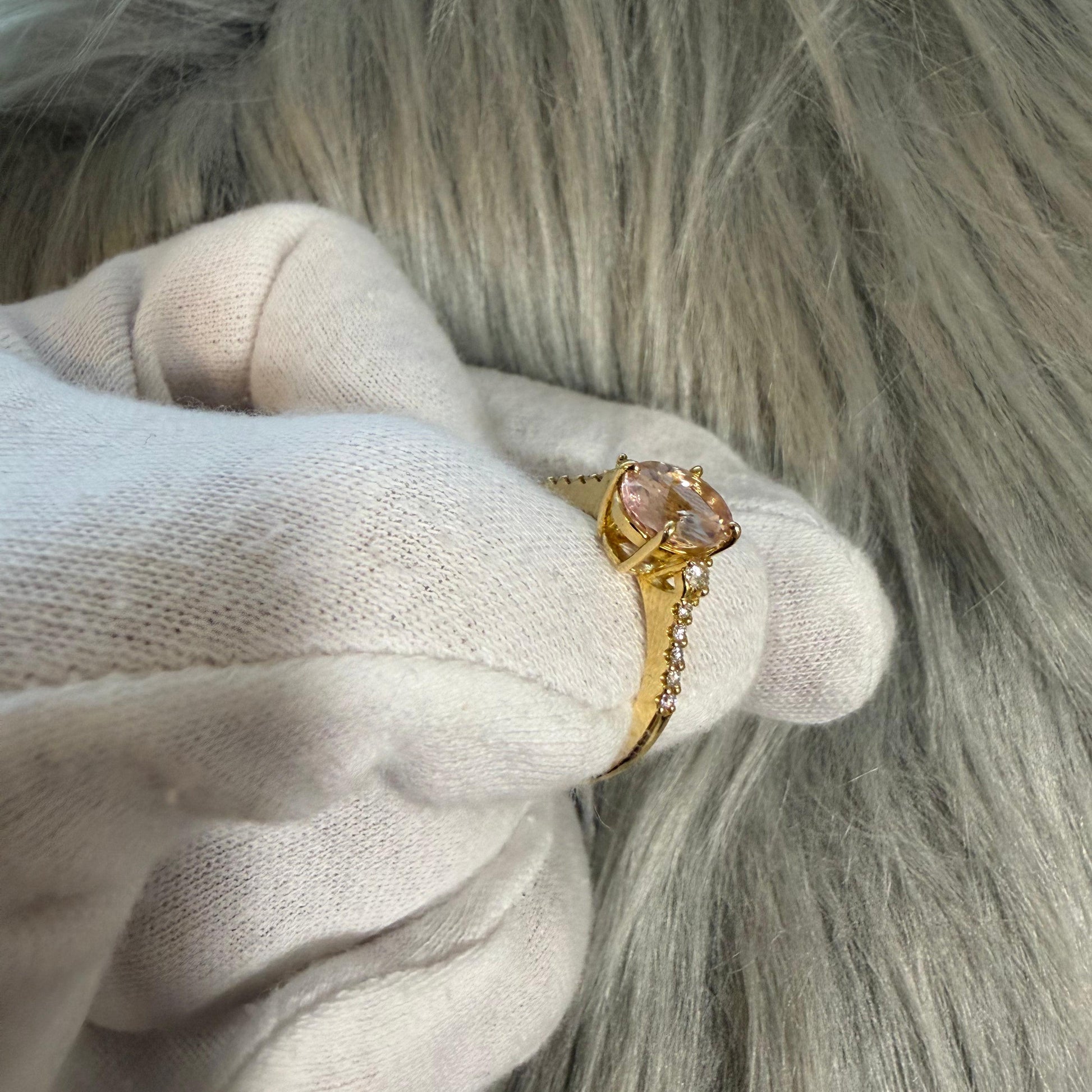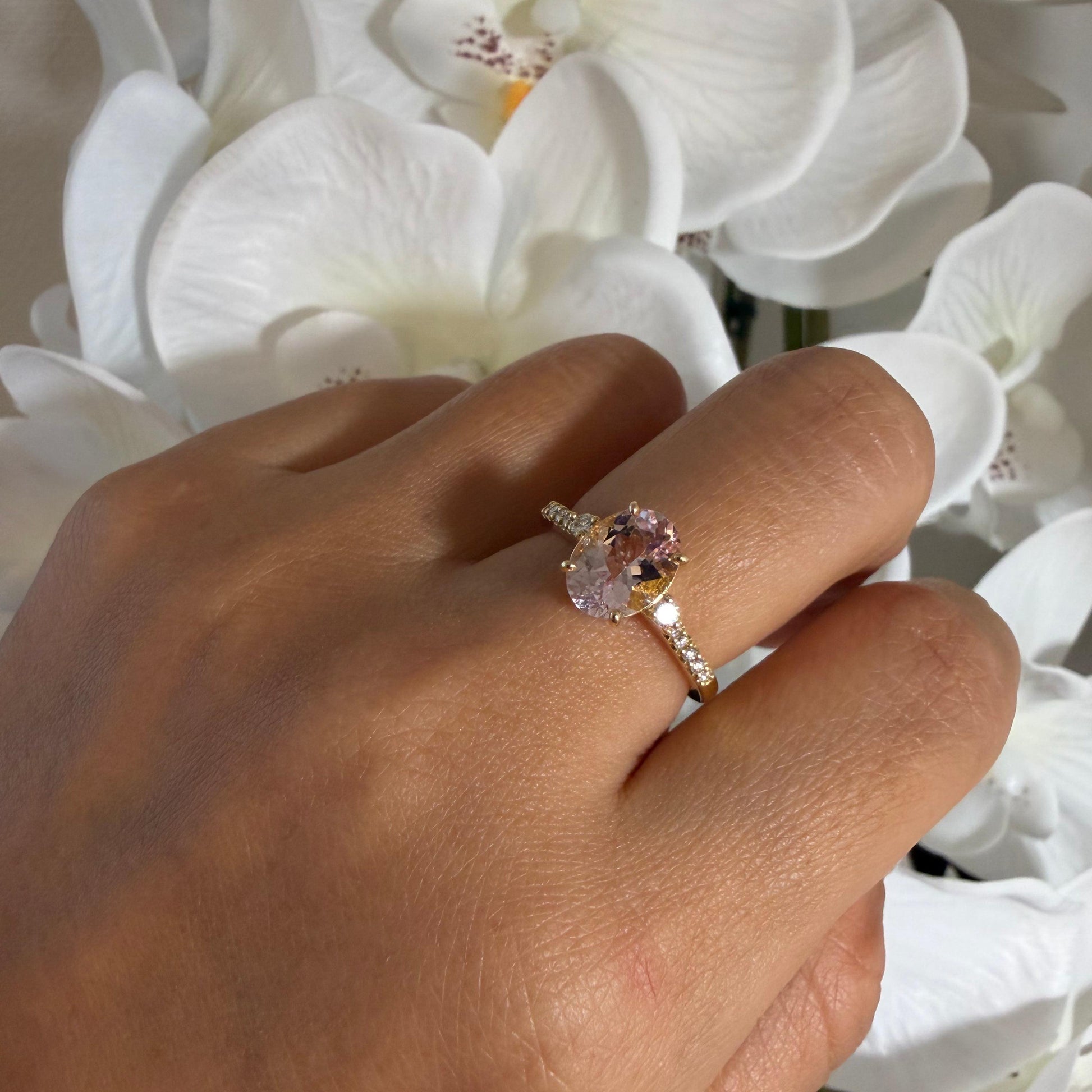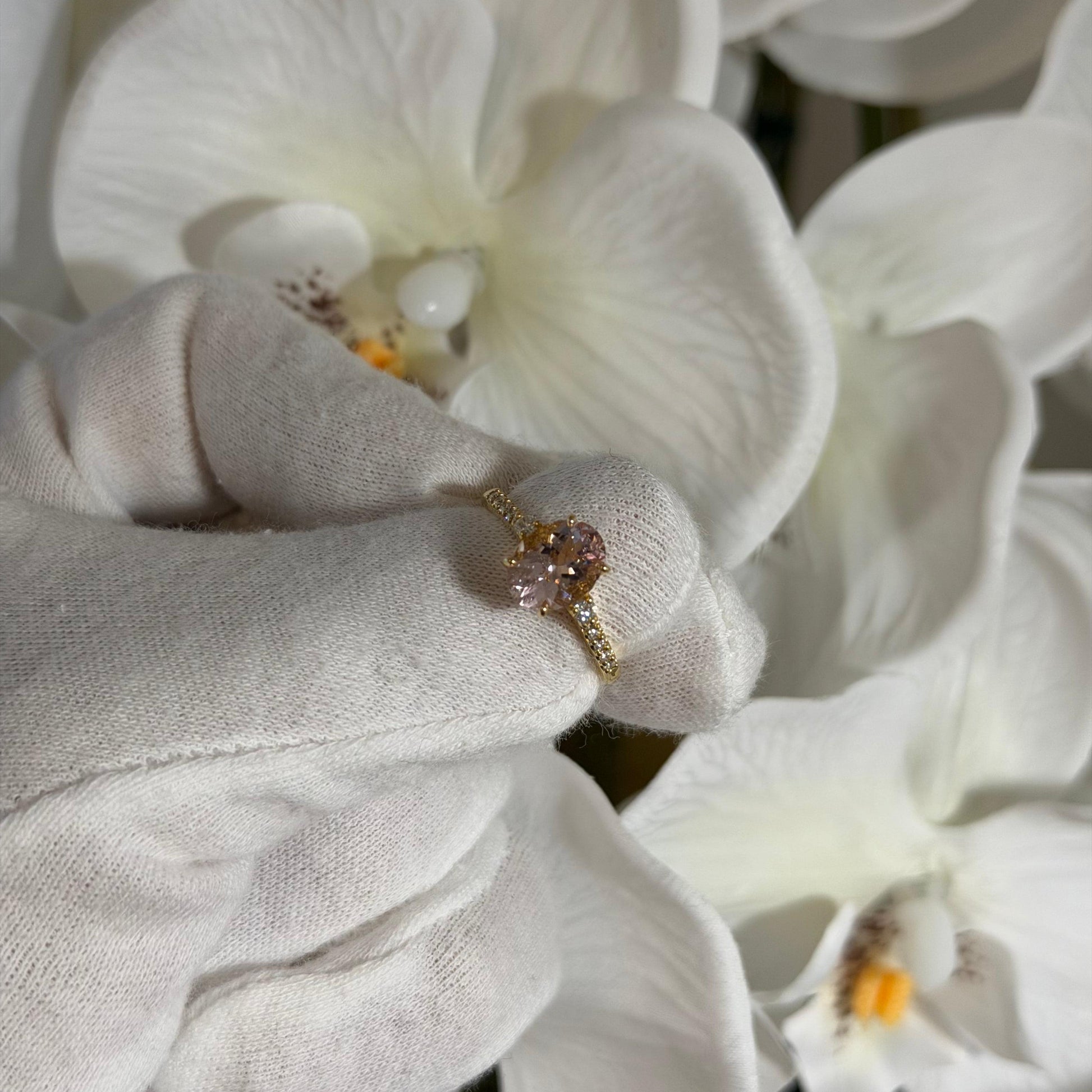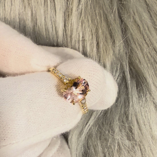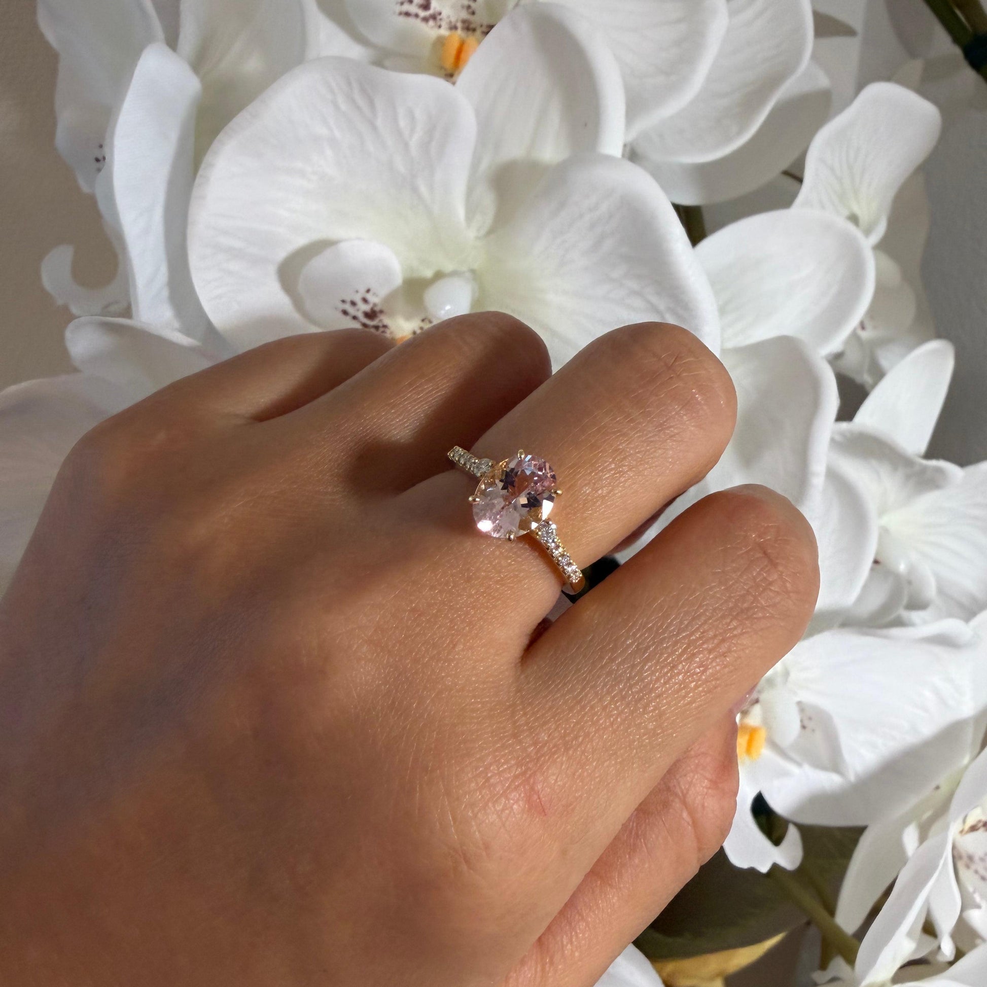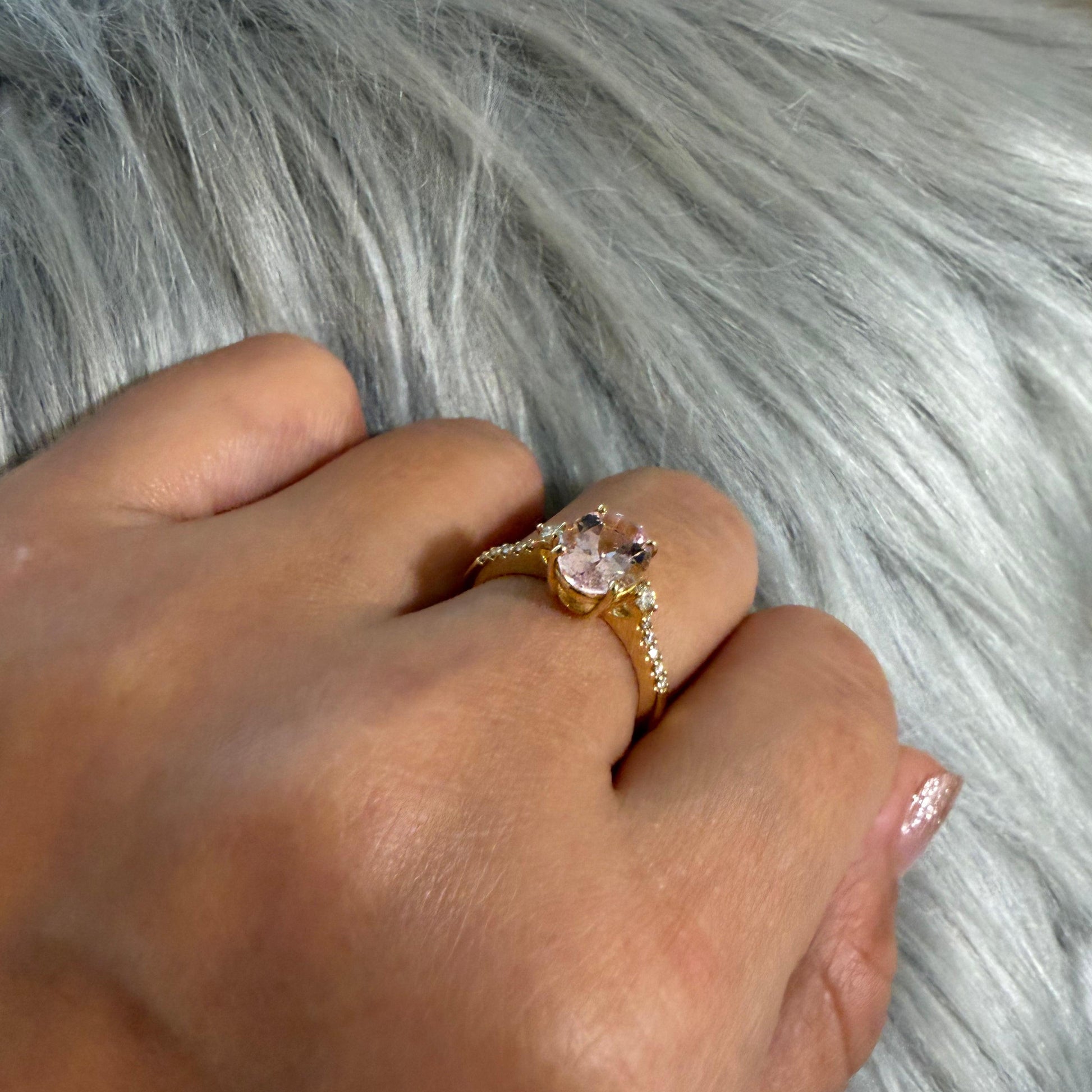 桜色のオーバルシェイプのモルガナイトx細身のアームにダイヤモンドを12石あしらったリング、Dance。