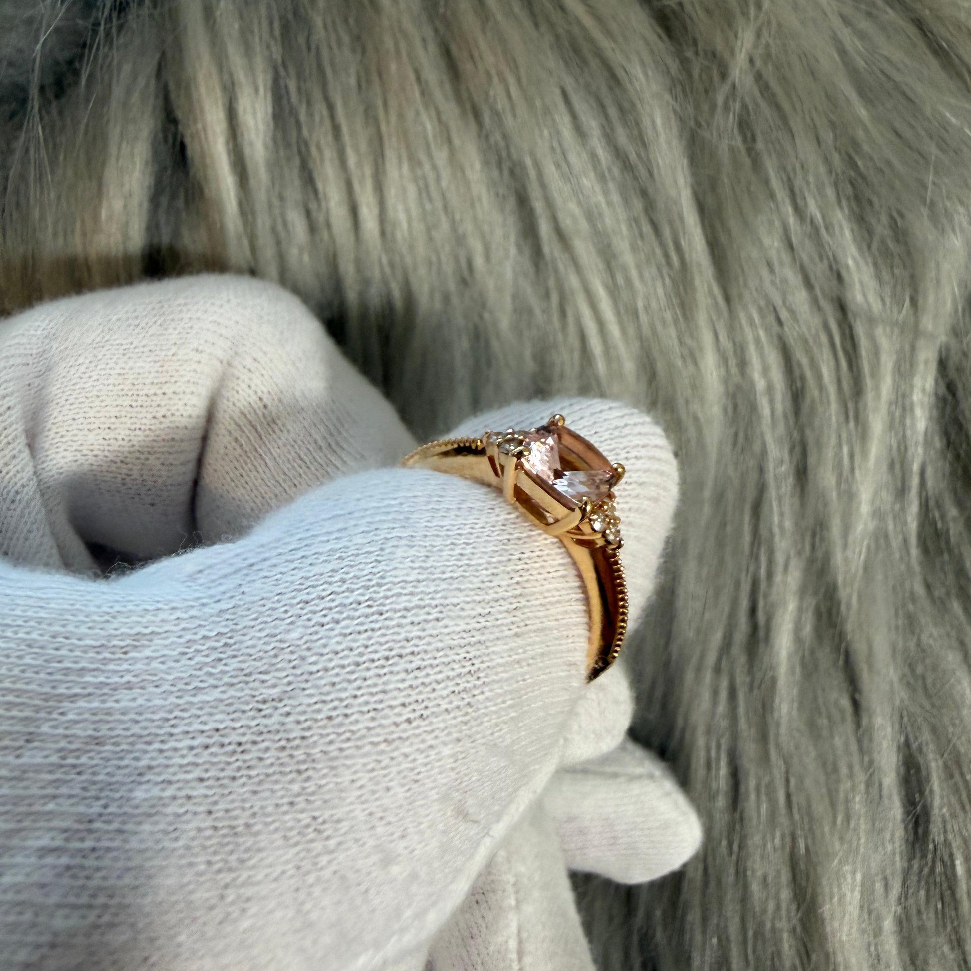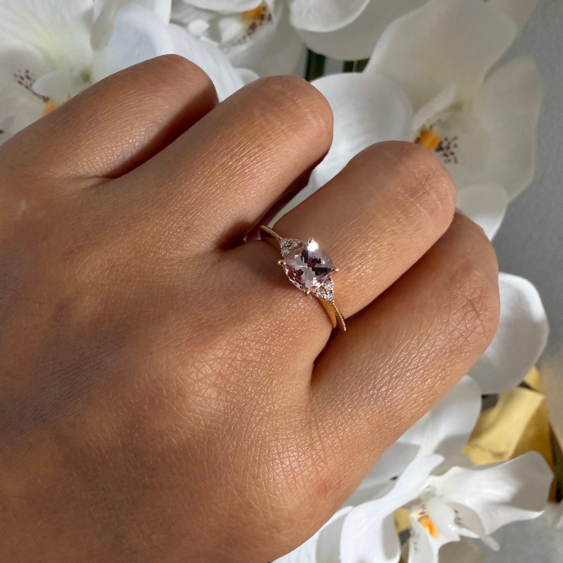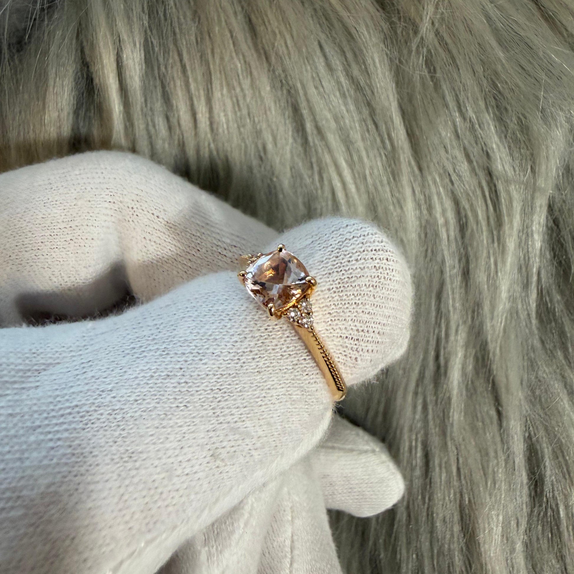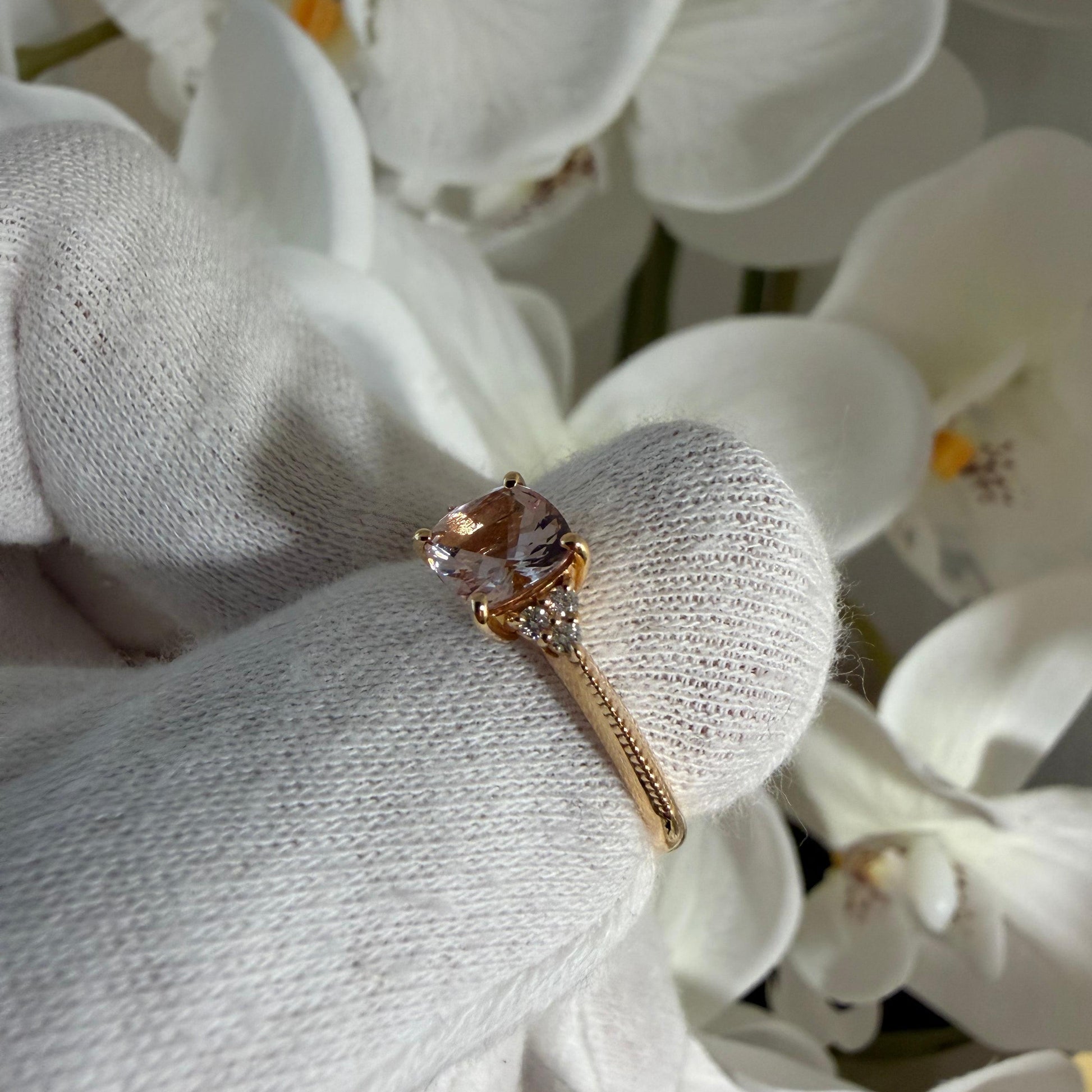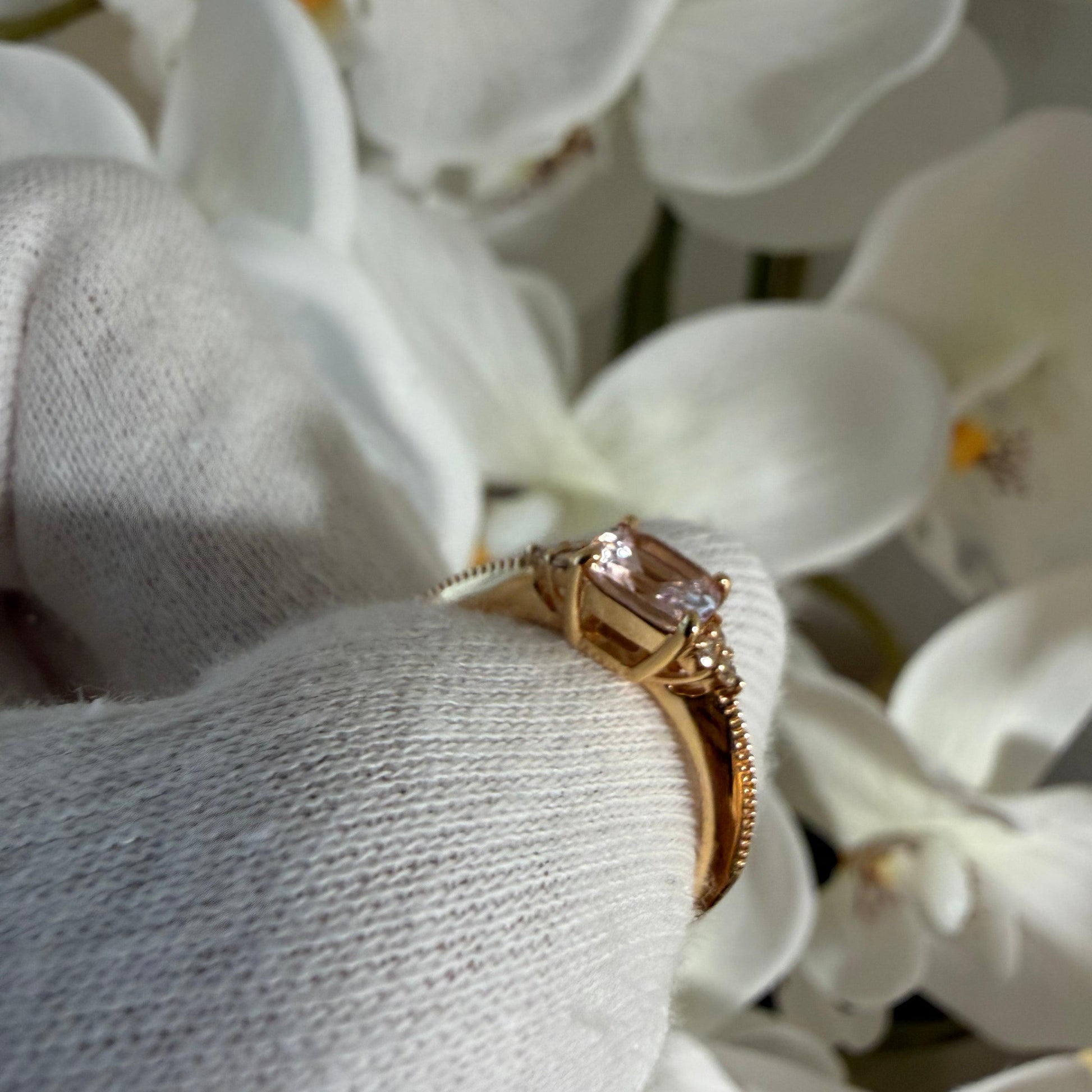淡く上品なピンクの輝きを持つスクエアシェイプのモルガナイトをセンターに据えた、優雅でタイムレスなリングです。