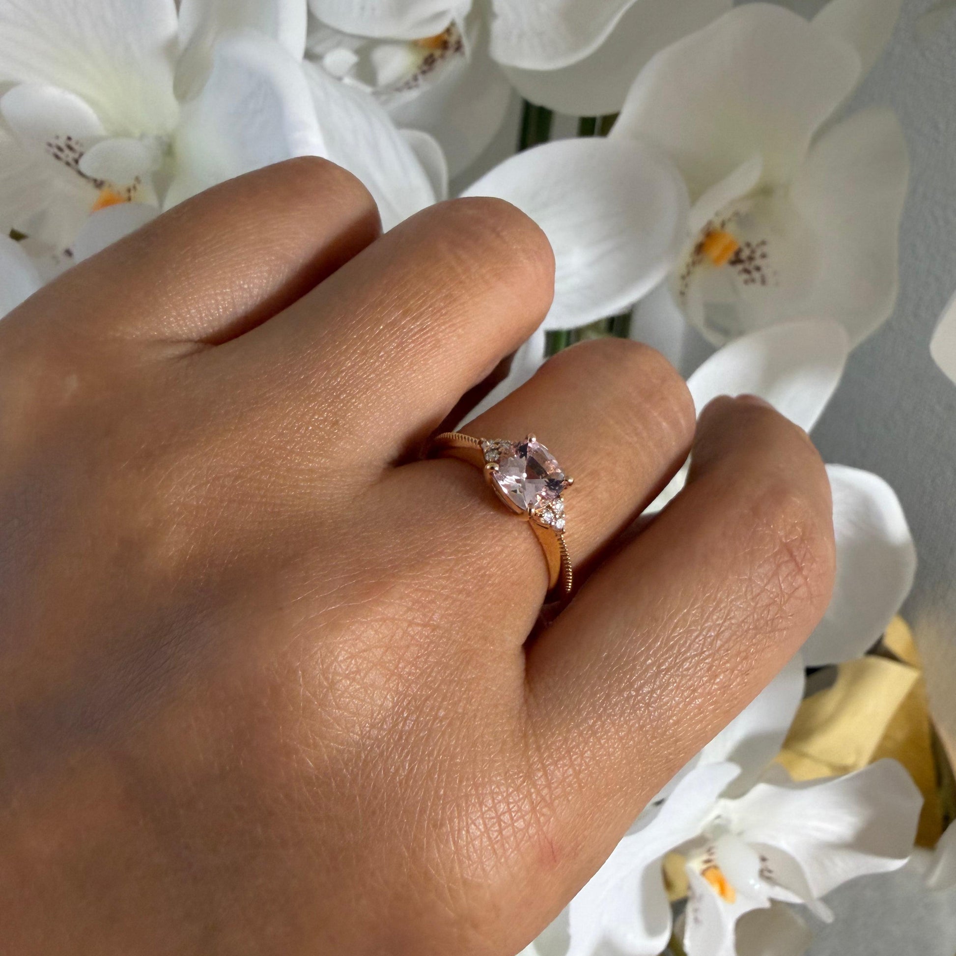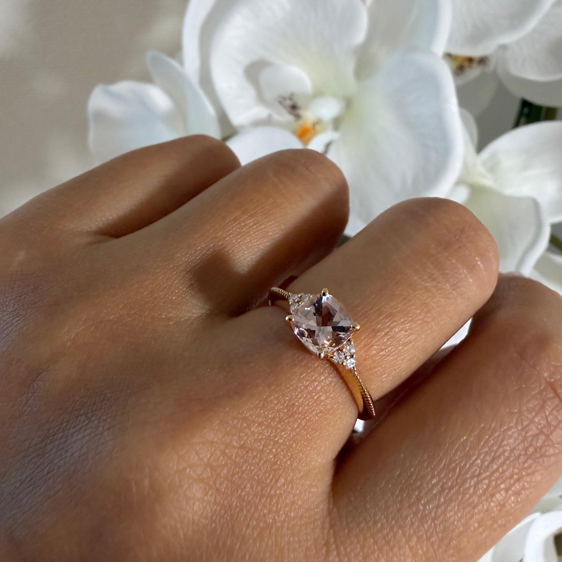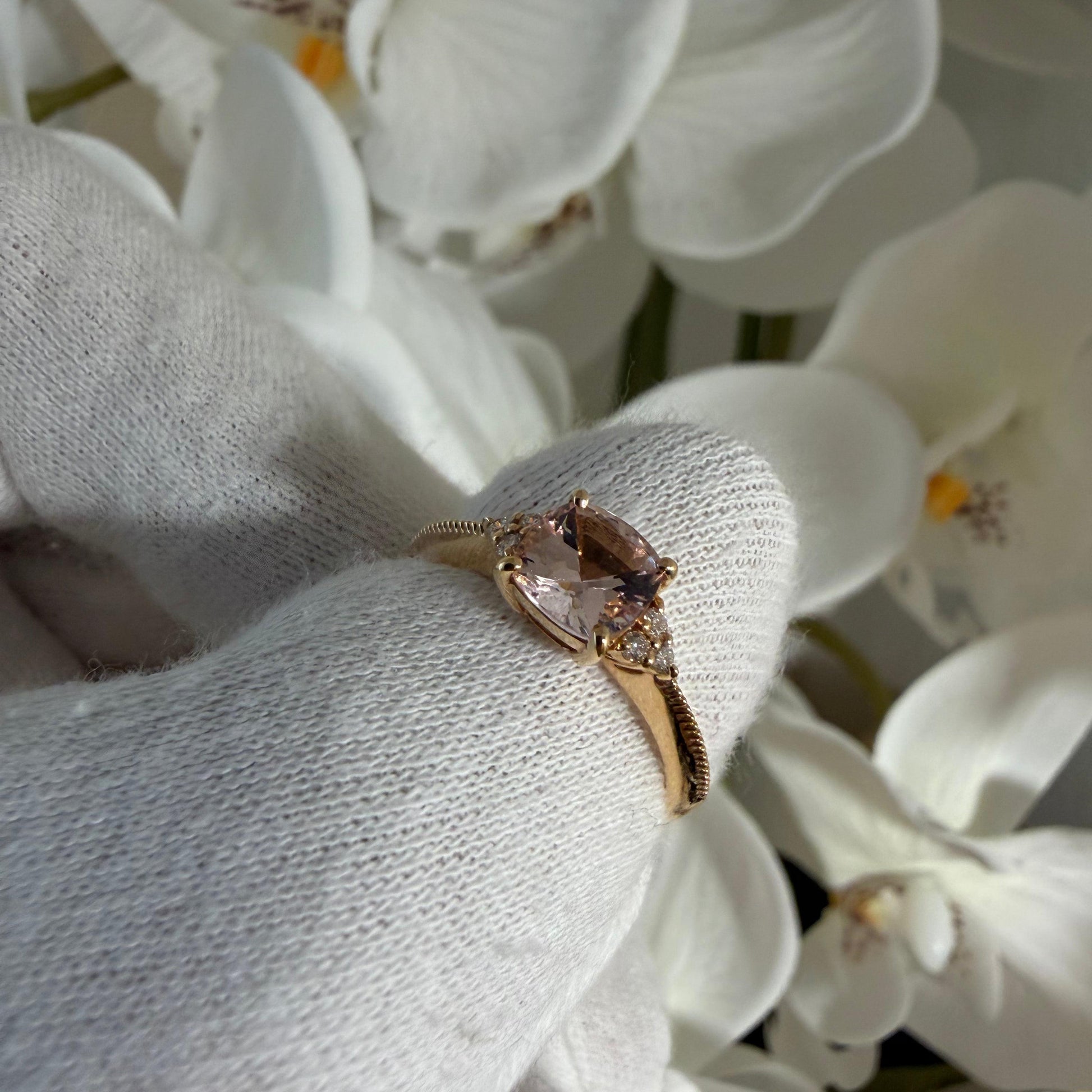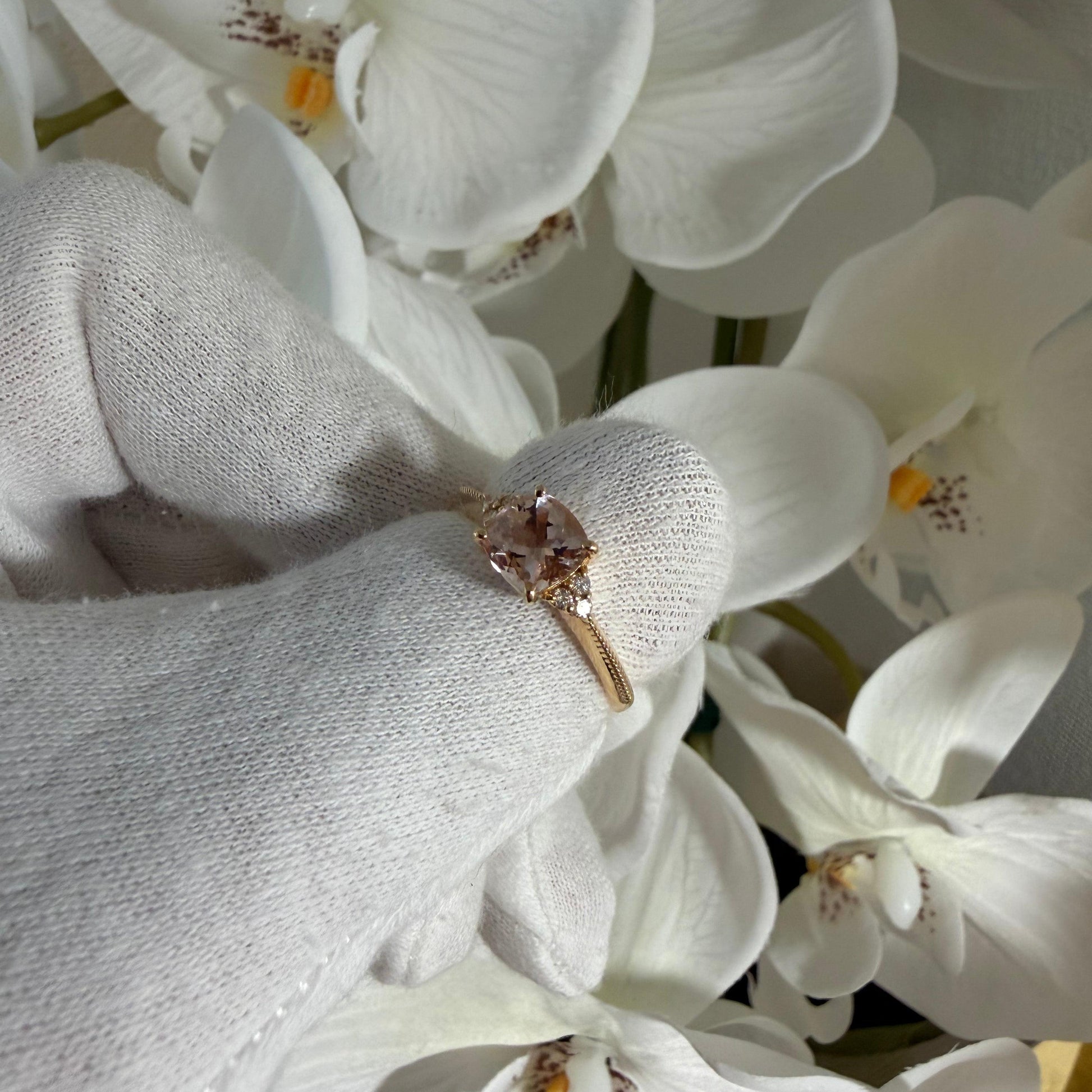 淡く上品なピンクの輝きを持つスクエアシェイプのモルガナイトをセンターに据えた、優雅でタイムレスなリングです。