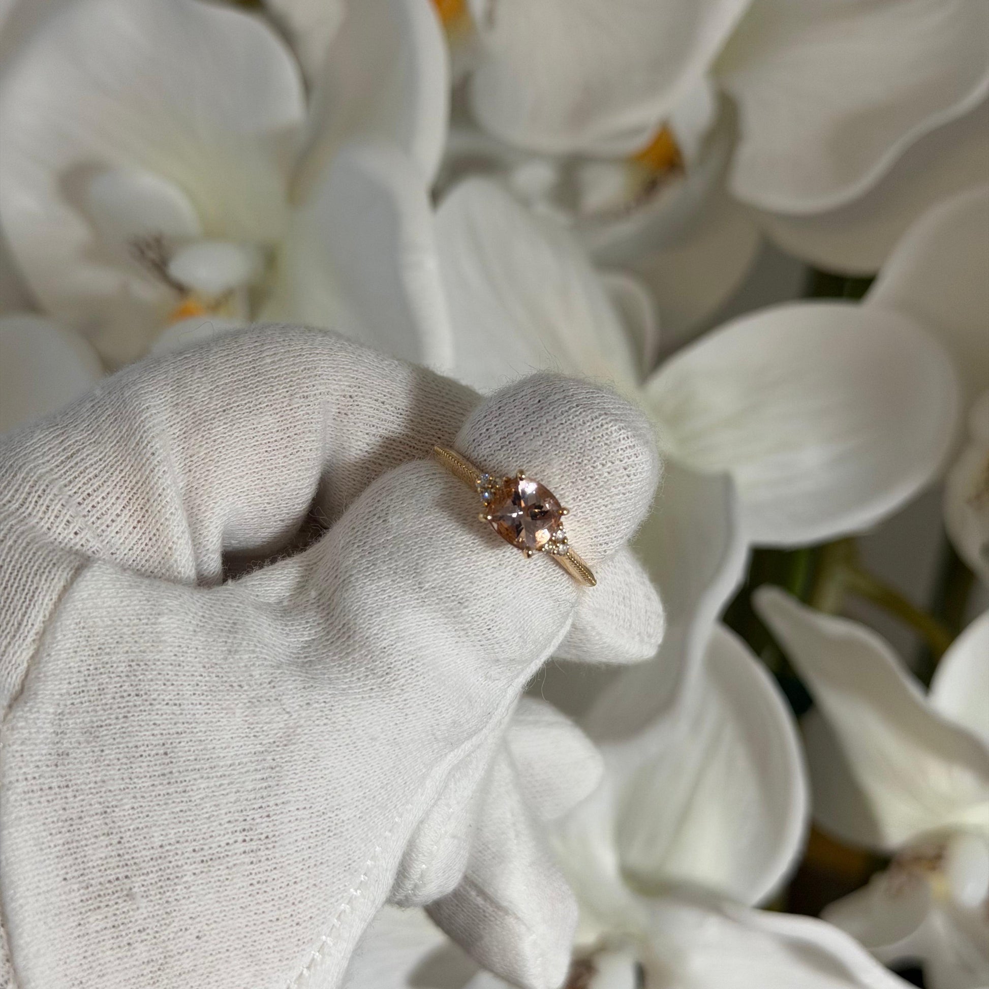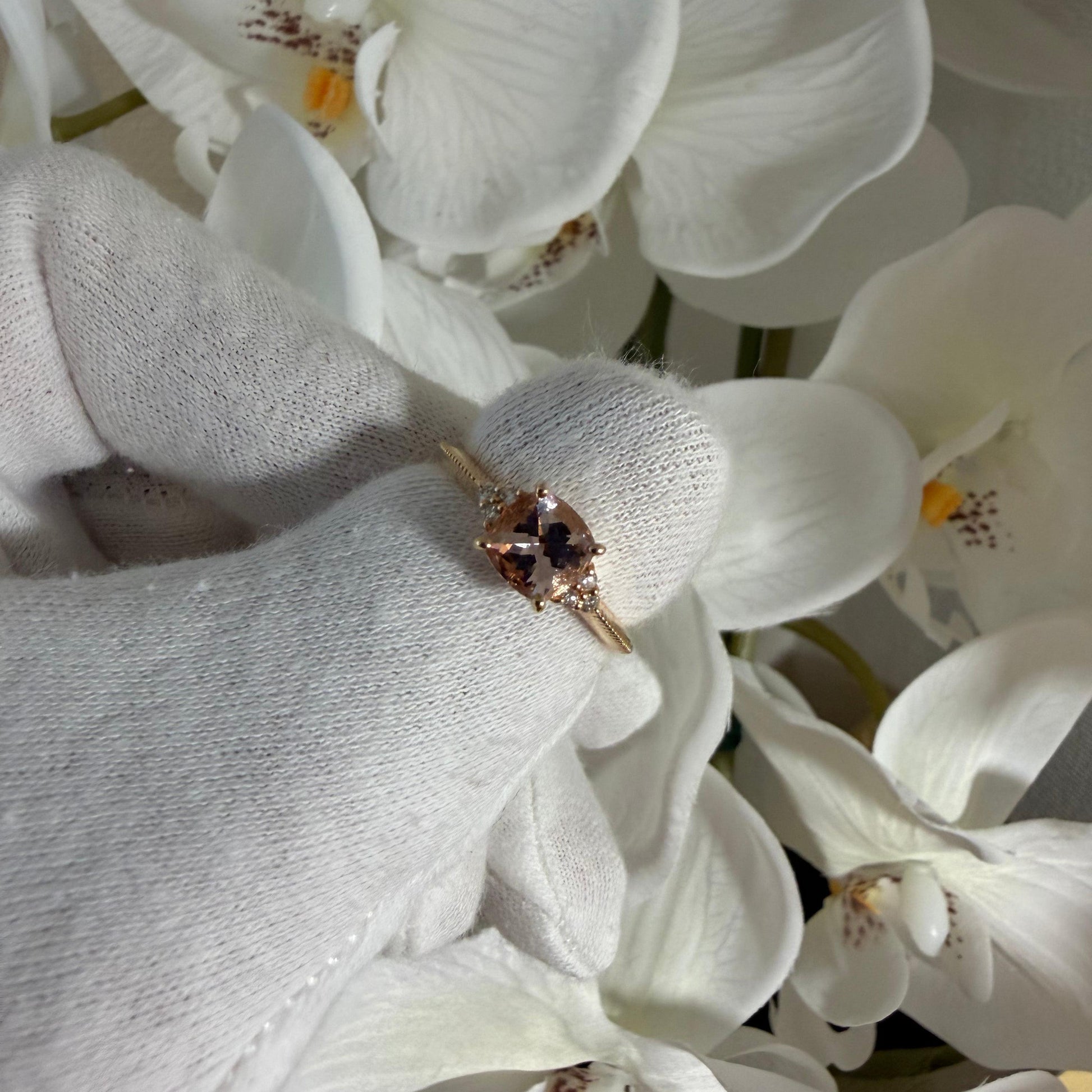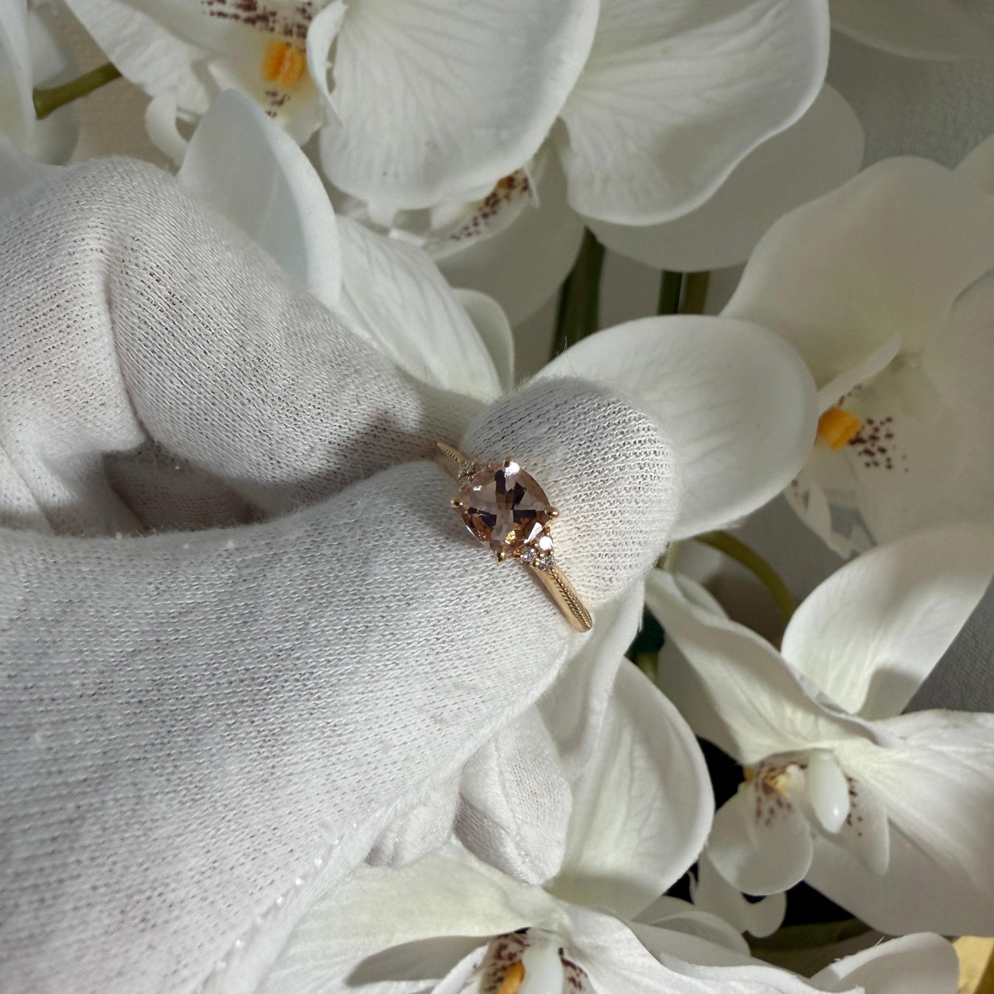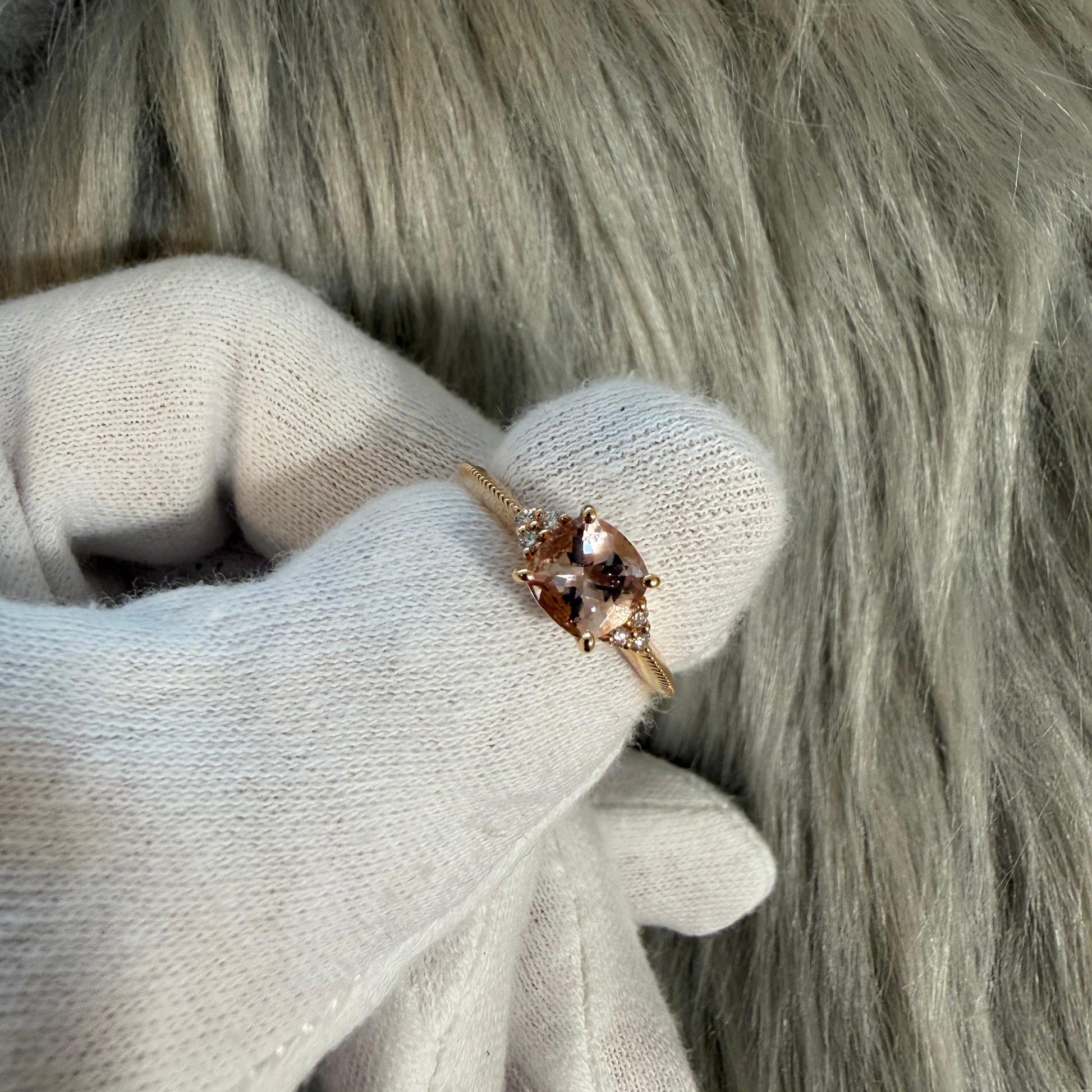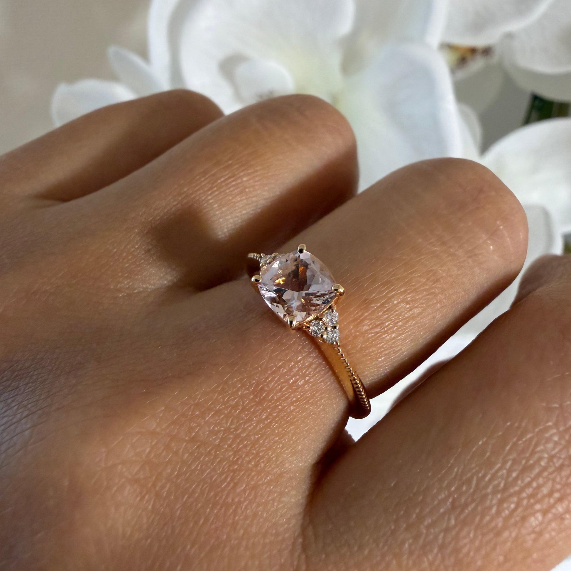 淡く上品なピンクの輝きを持つスクエアシェイプのモルガナイトをセンターに据えた、優雅でタイムレスなリングです。