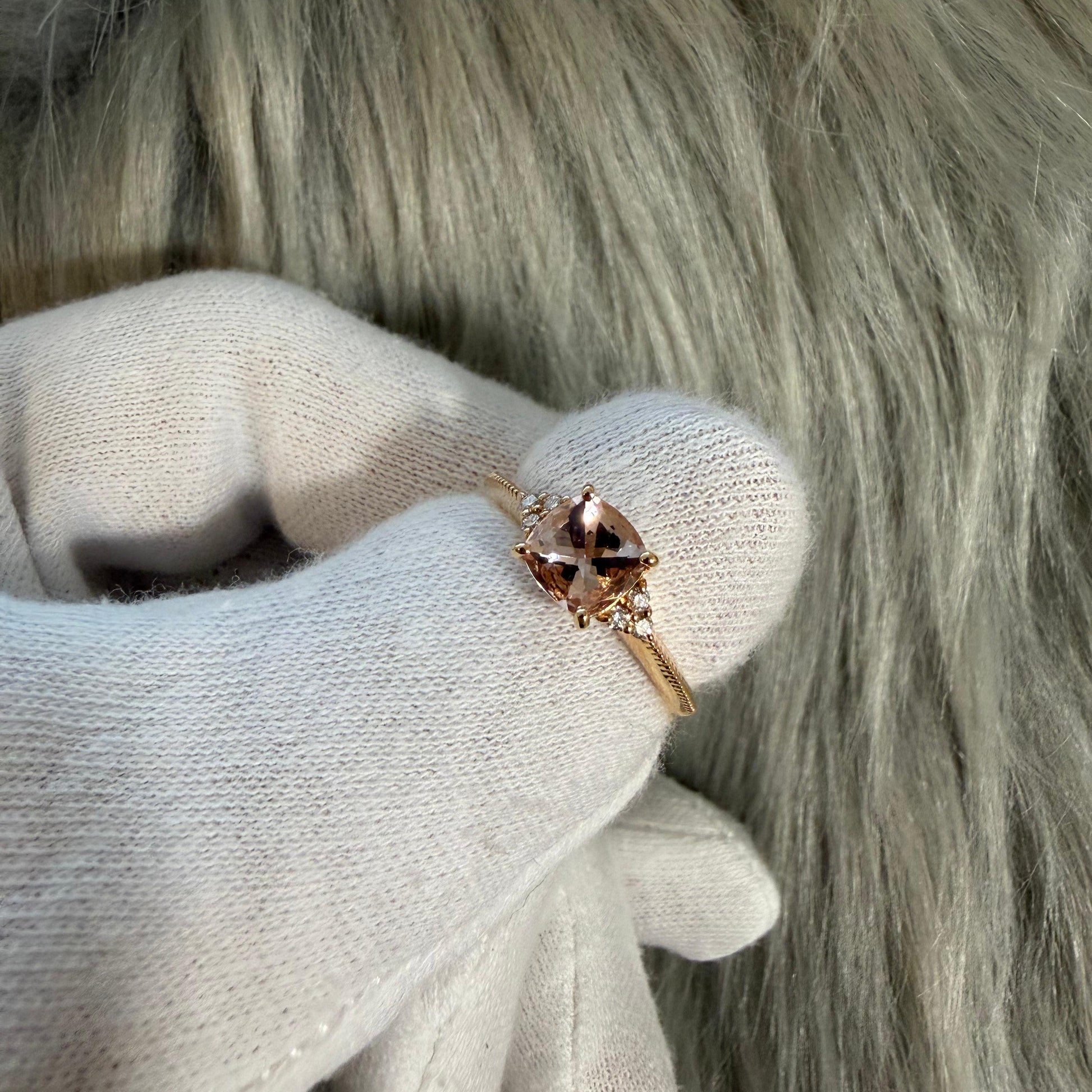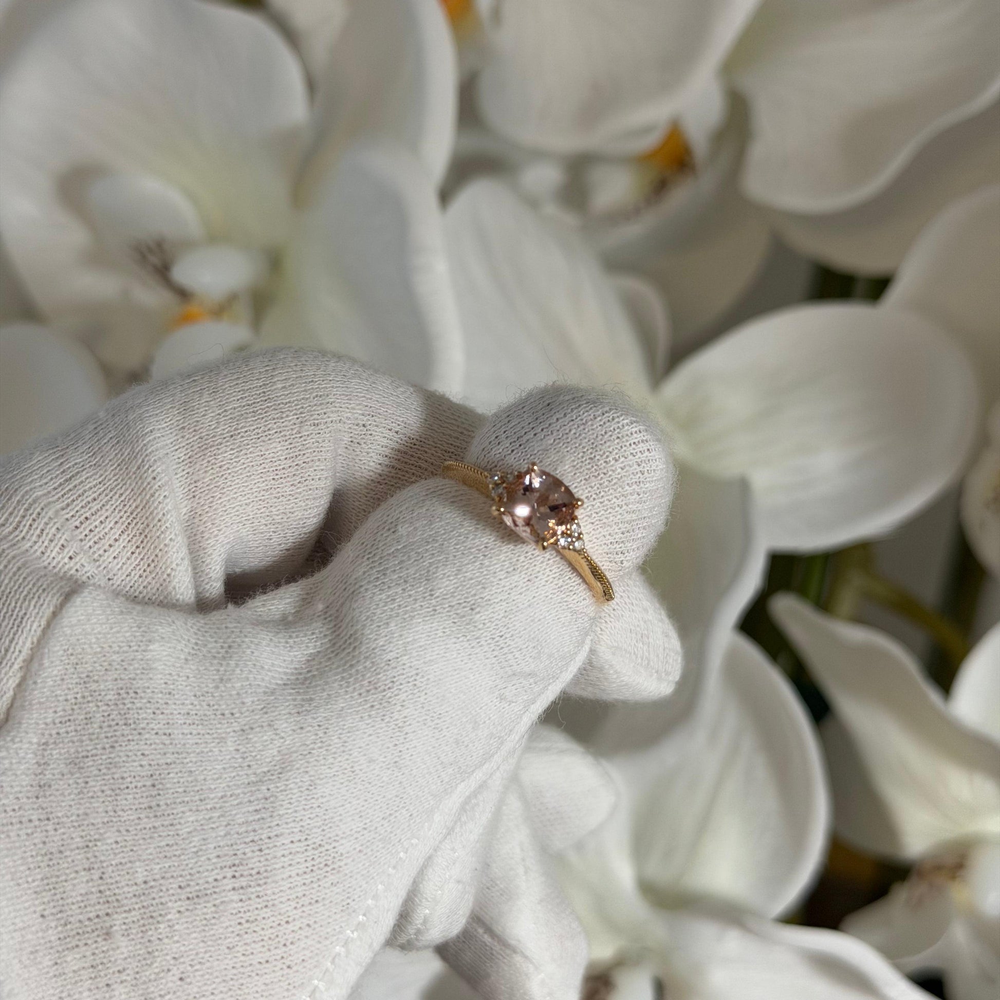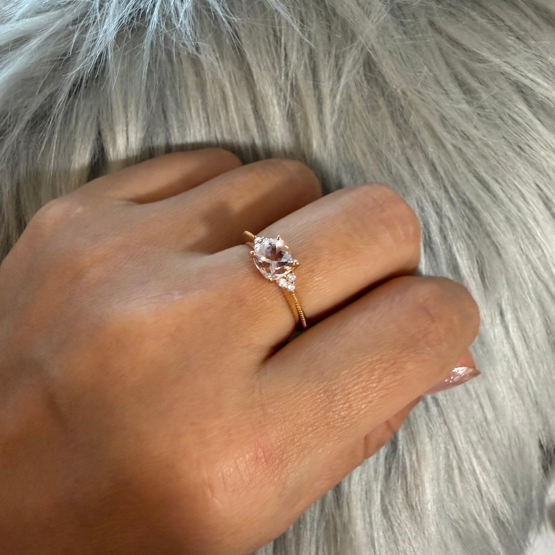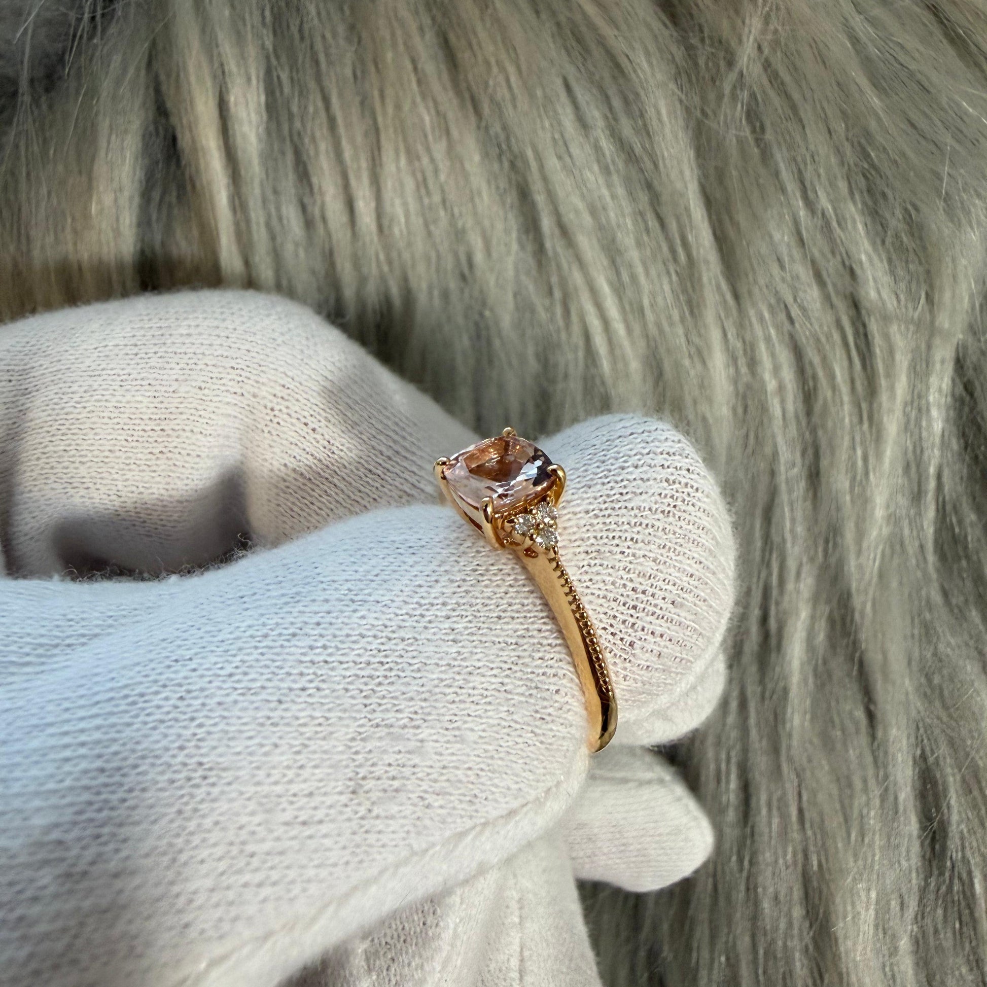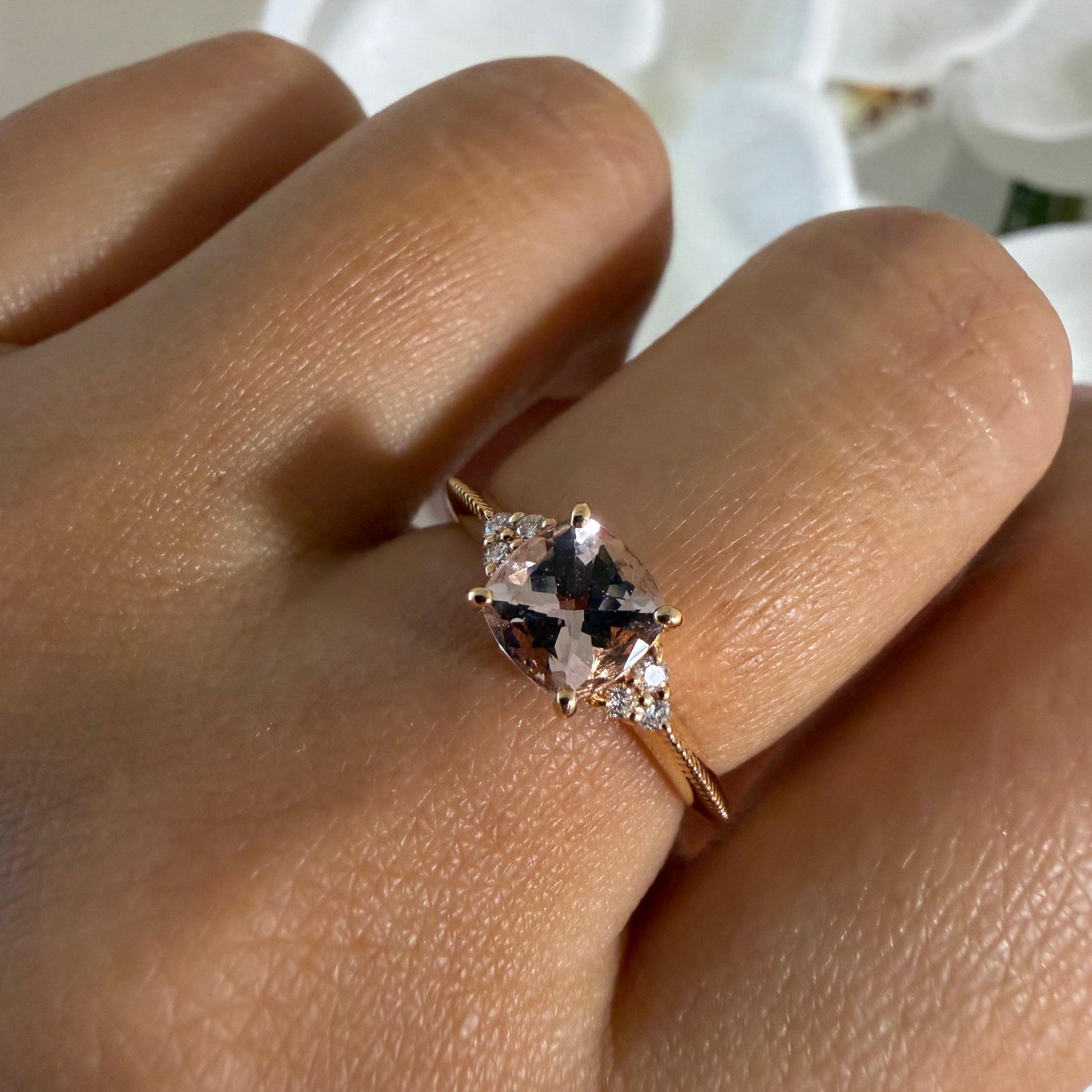 淡く上品なピンクの輝きを持つスクエアシェイプのモルガナイトをセンターに据えた、優雅でタイムレスなリングです。