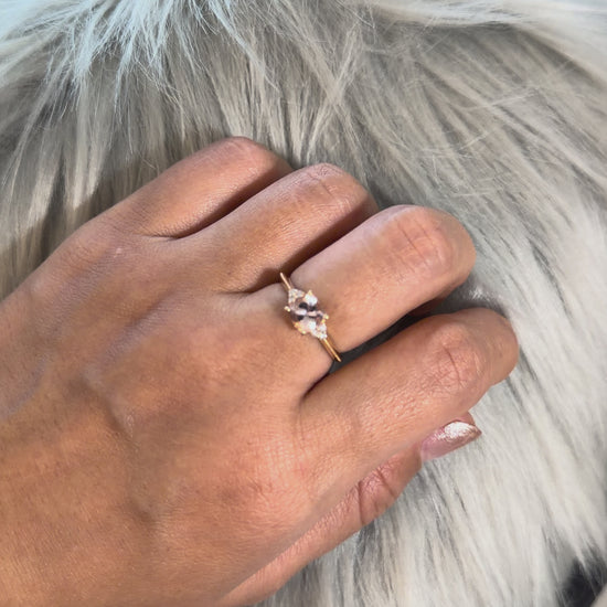 淡いピンクゴールドのミル打ちアームがさらに石の美しさを引き立て、繊細なダイヤモンドのアクセントが華やかさをプラス。