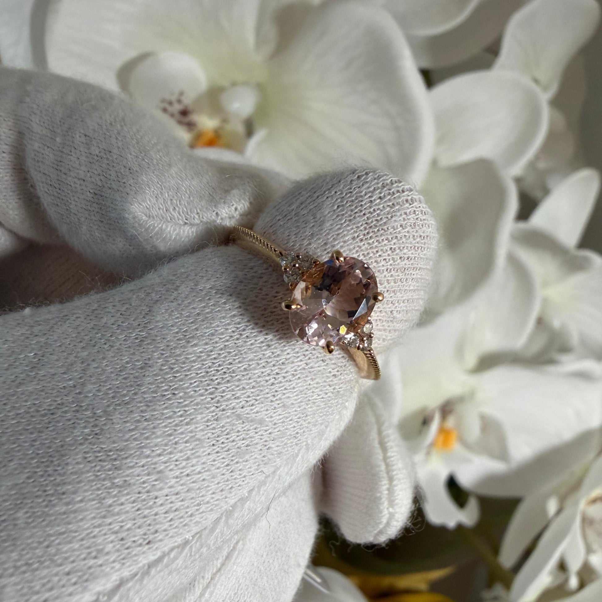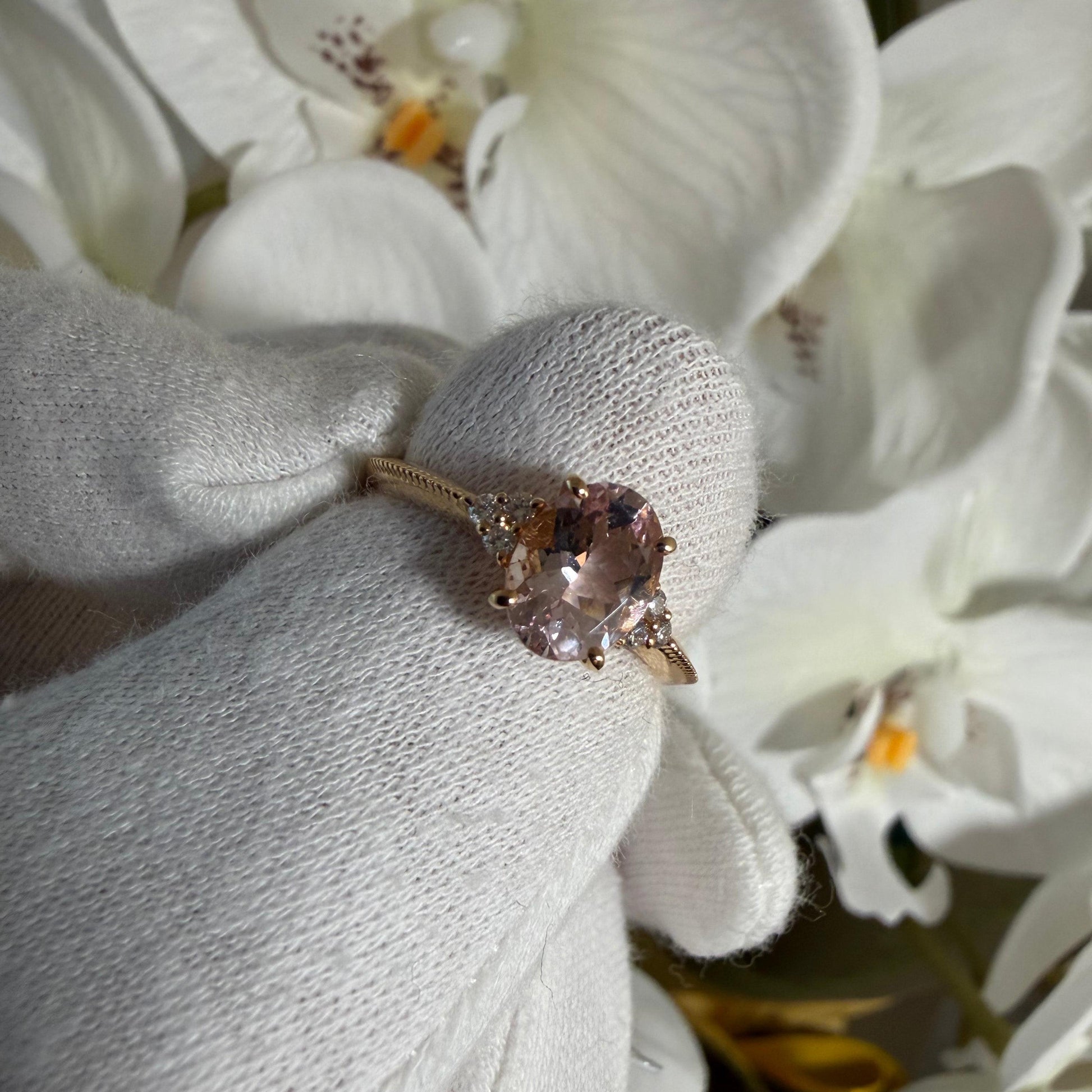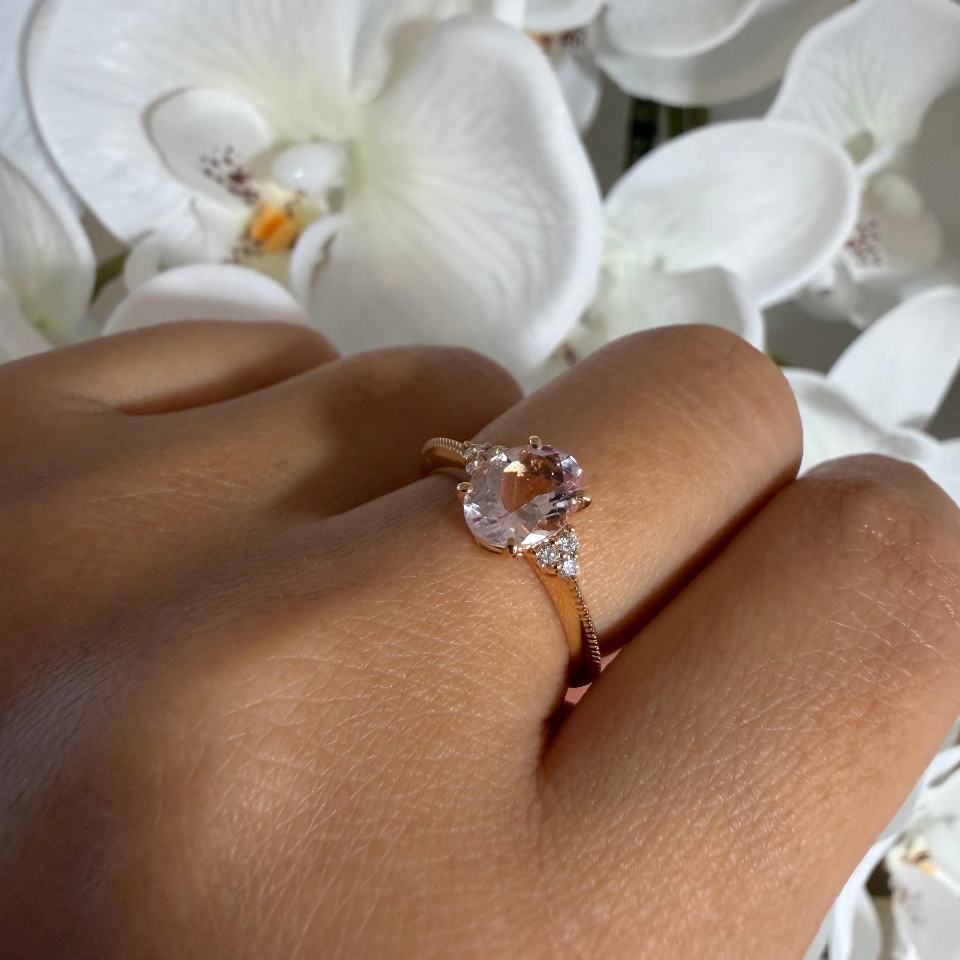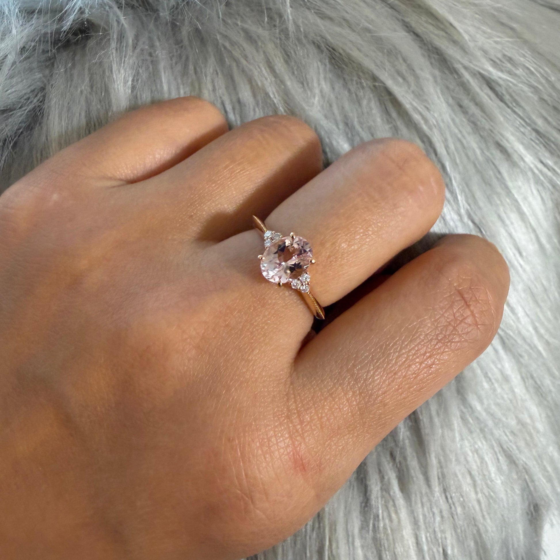 淡くとろける色合いのオーバルシェイプのモルガナイトx左右に6石のダイヤモンド。