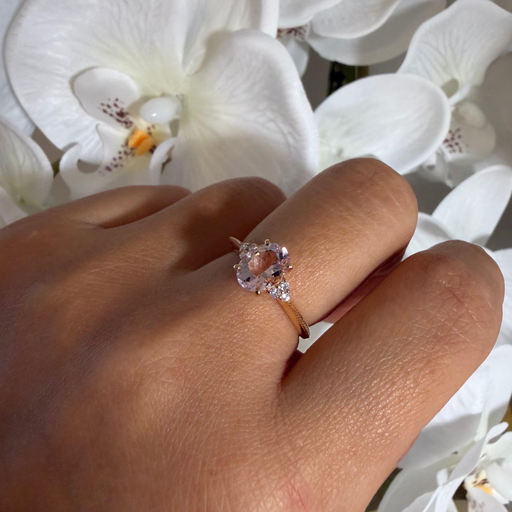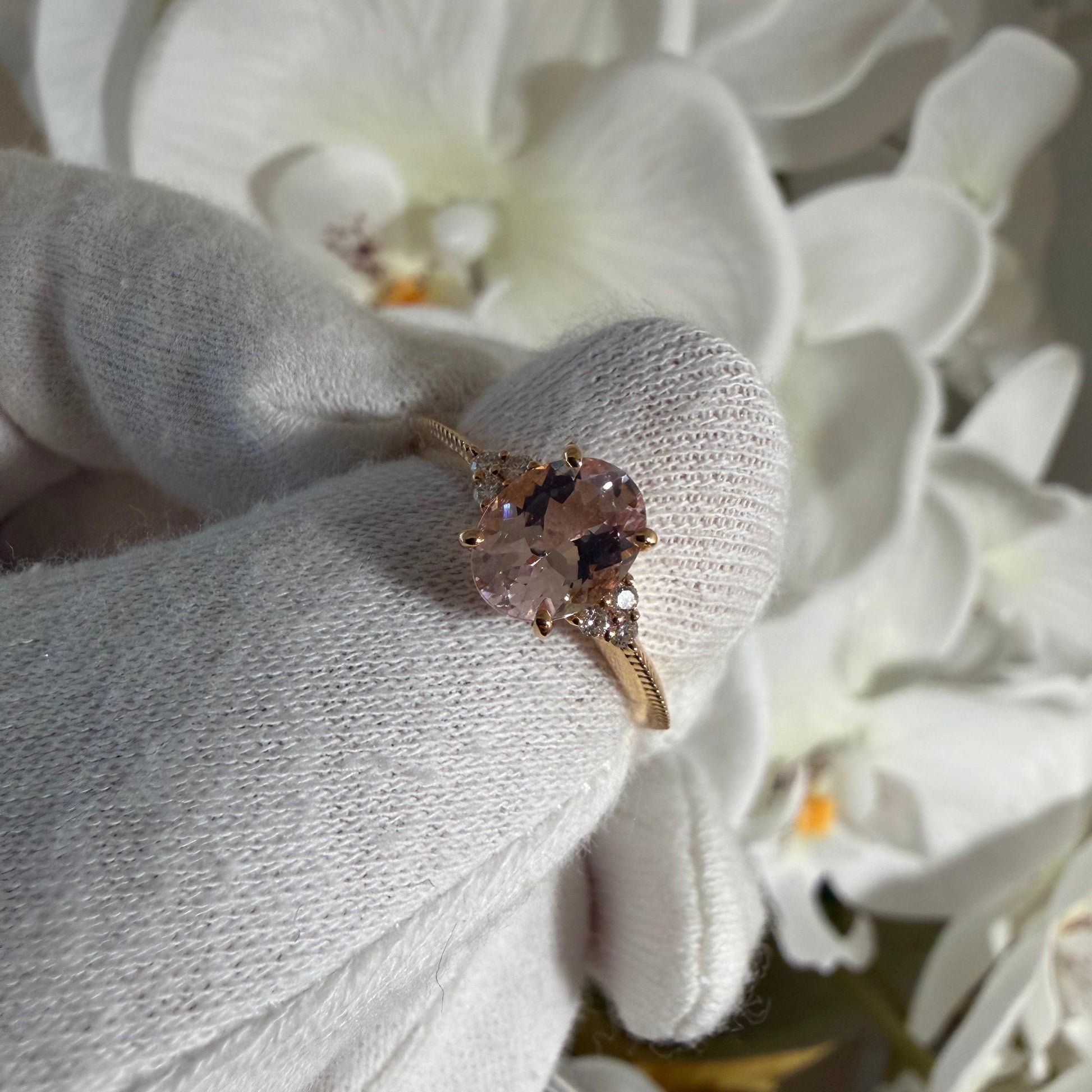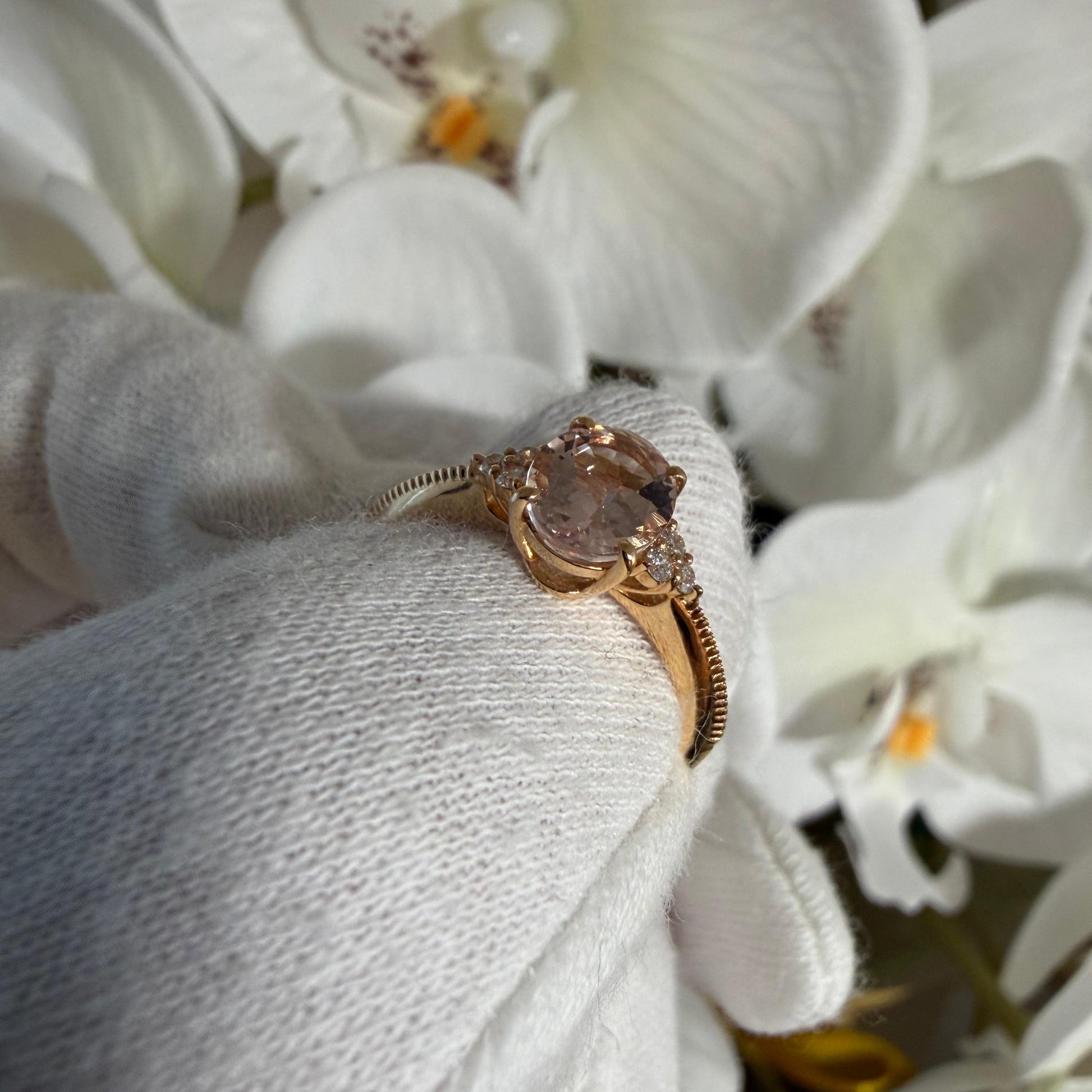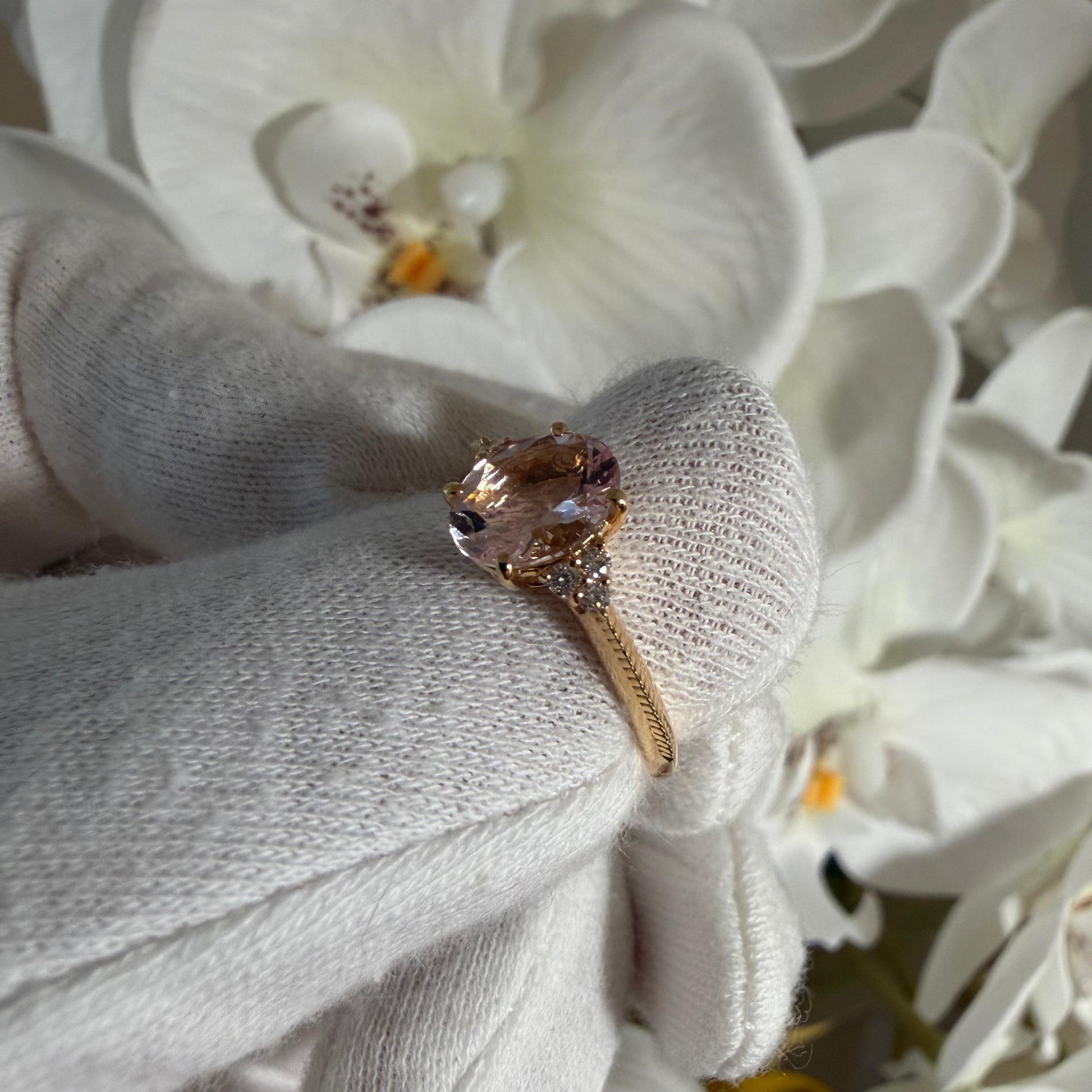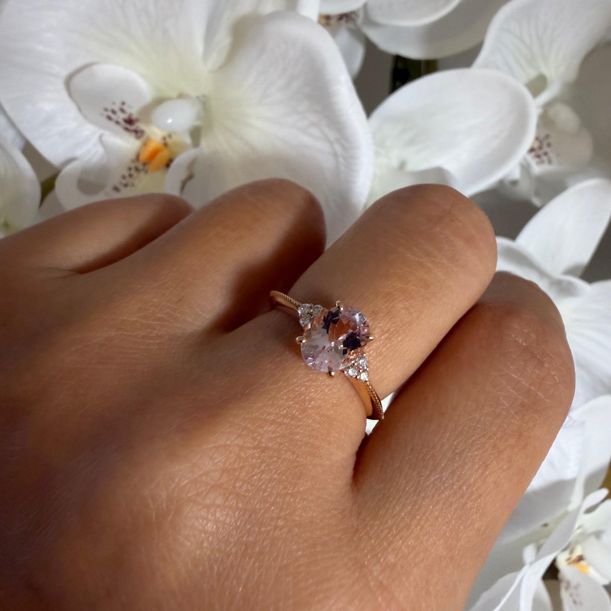 淡くとろける色合いのオーバルシェイプのモルガナイトx左右に6石のダイヤモンド。