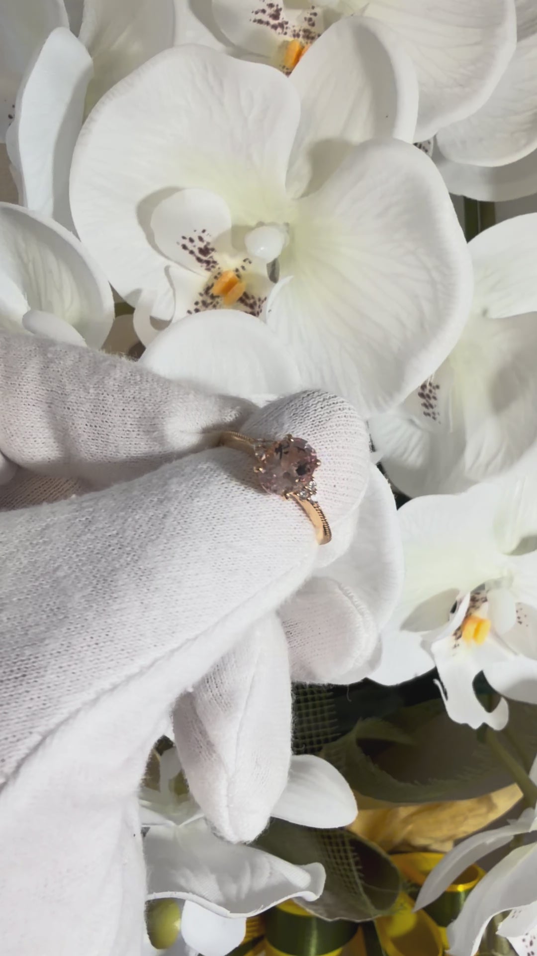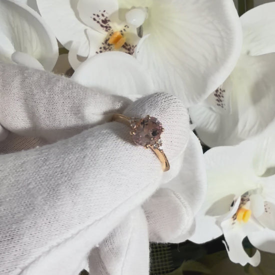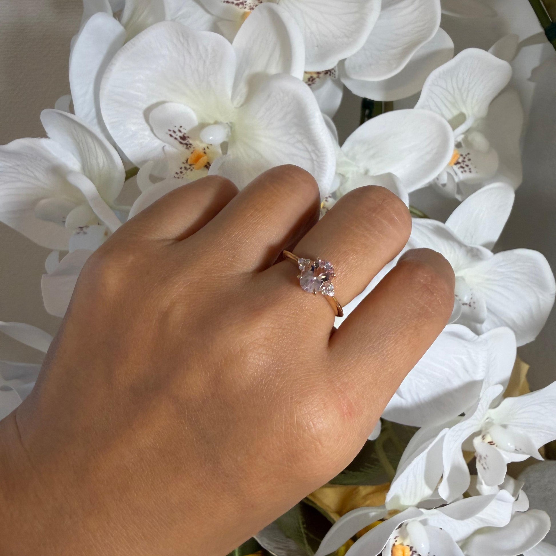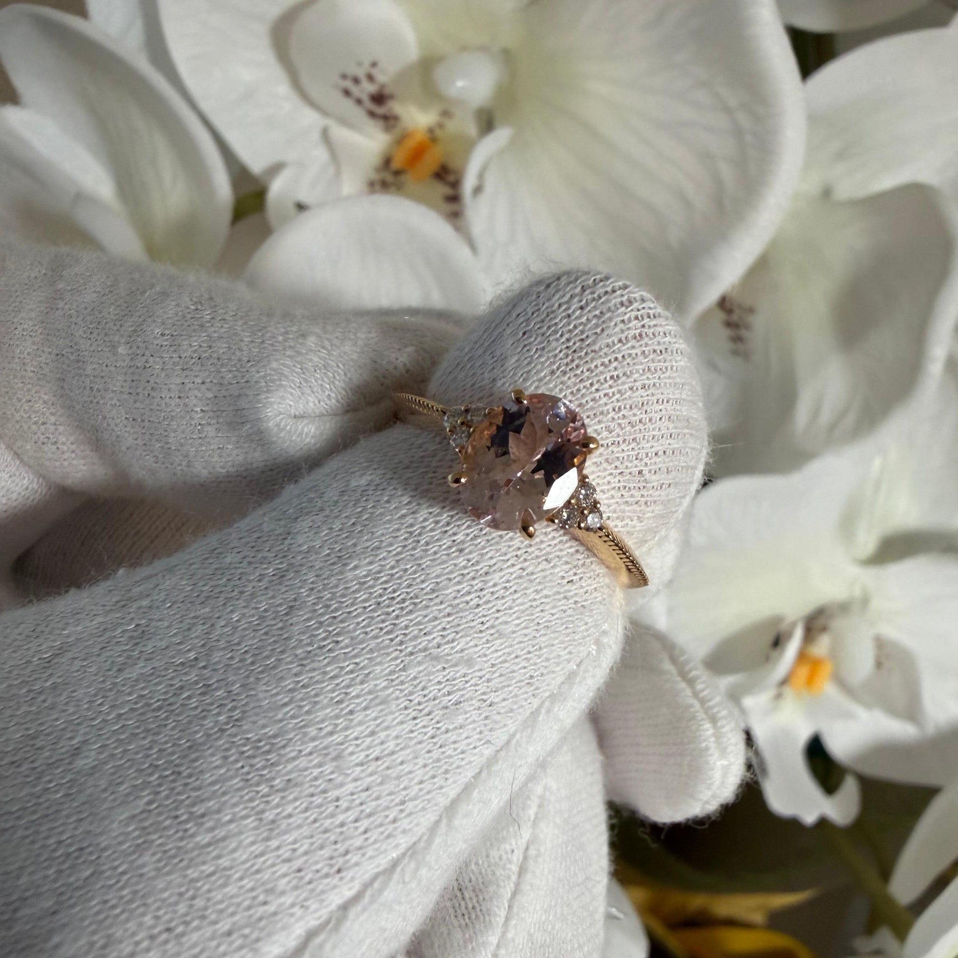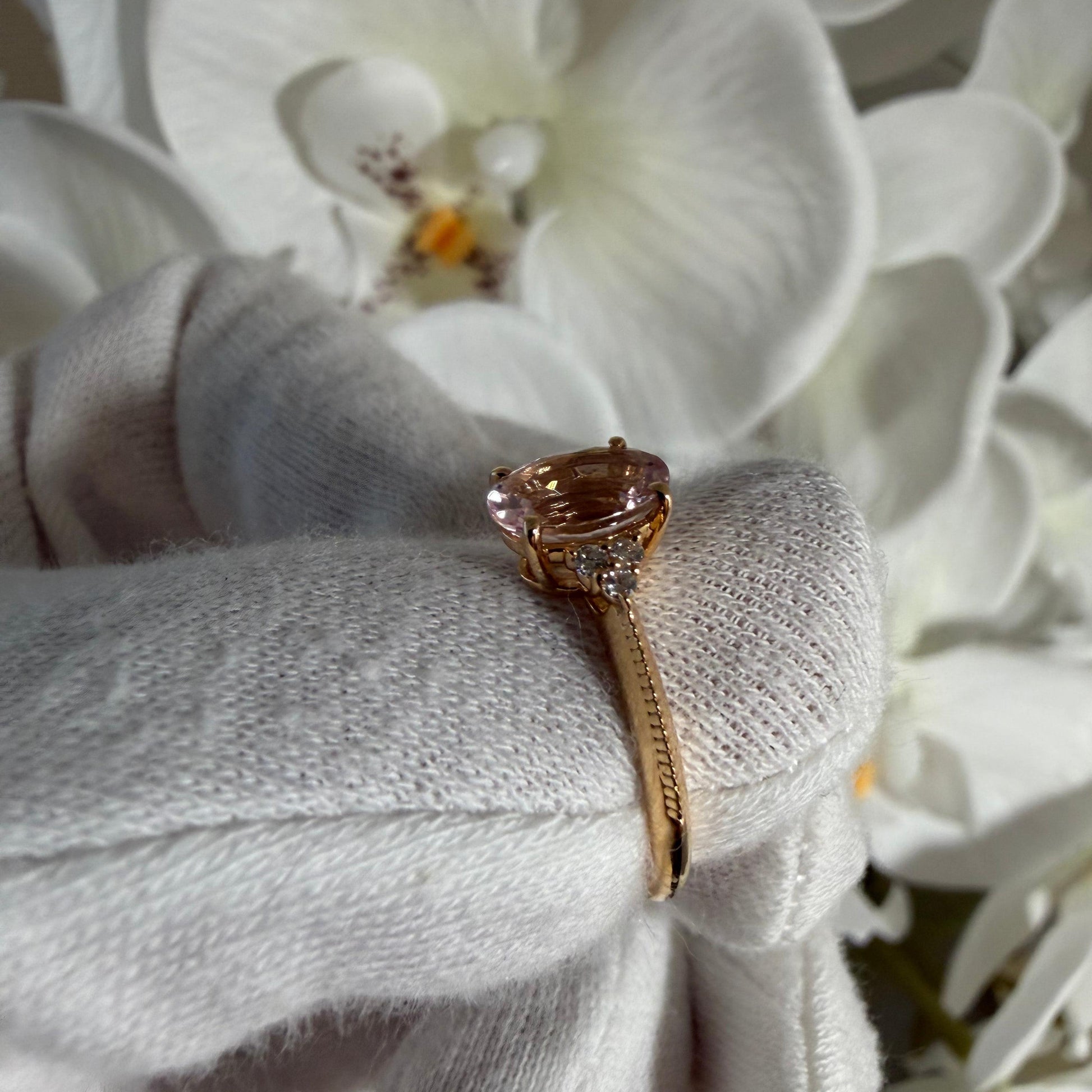 淡くとろける色合いのオーバルシェイプのモルガナイトx左右に6石のダイヤモンド。