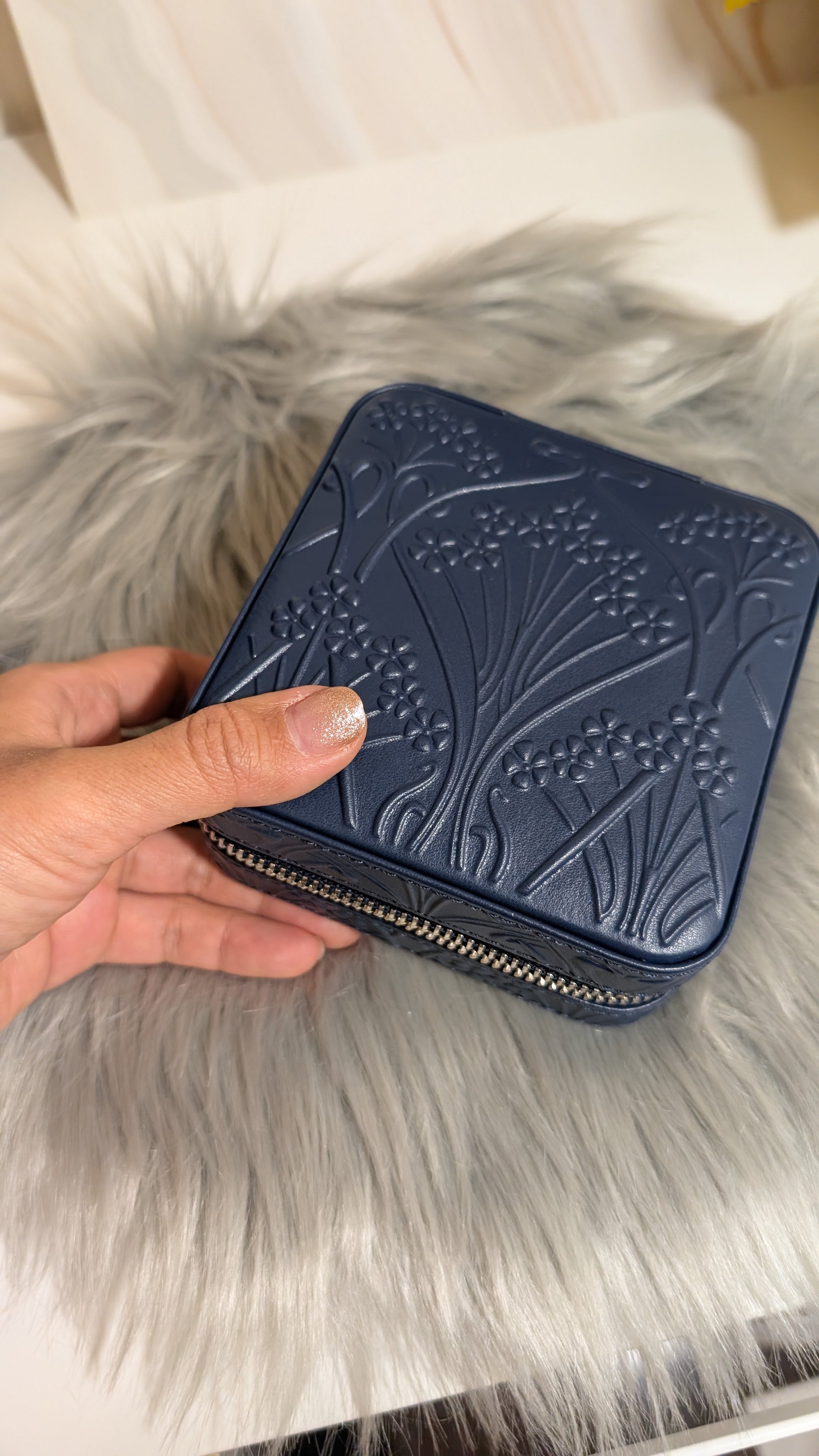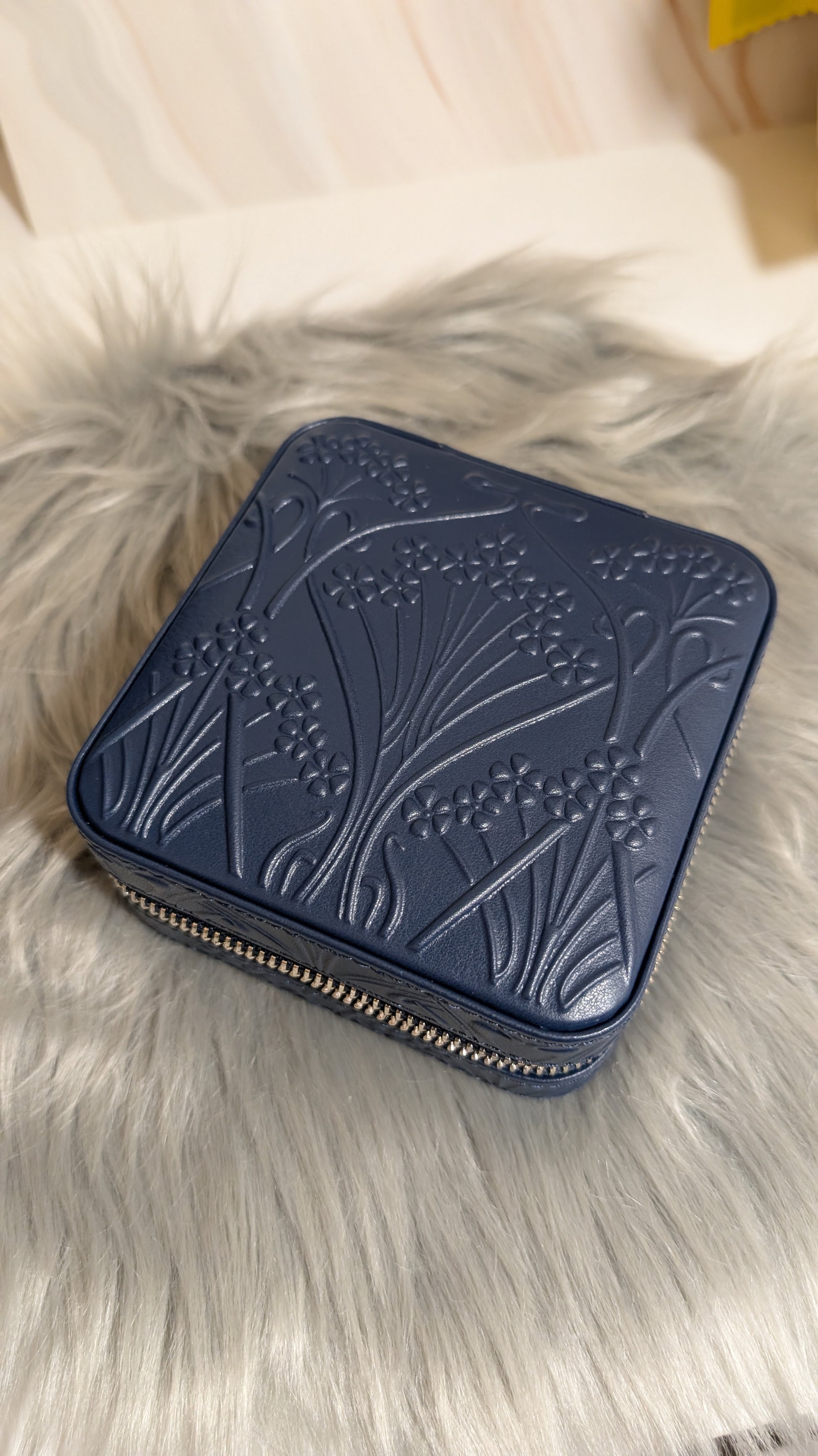 「WOLF × LIBERTY」スモール トラベル ジュエリー ジップケースは、リバティを象徴する Ianthe(イアンシー)柄 をエンボス加工で施し、ネイビーブルーのバイオベース素材を使用して丁寧に仕上げられています。