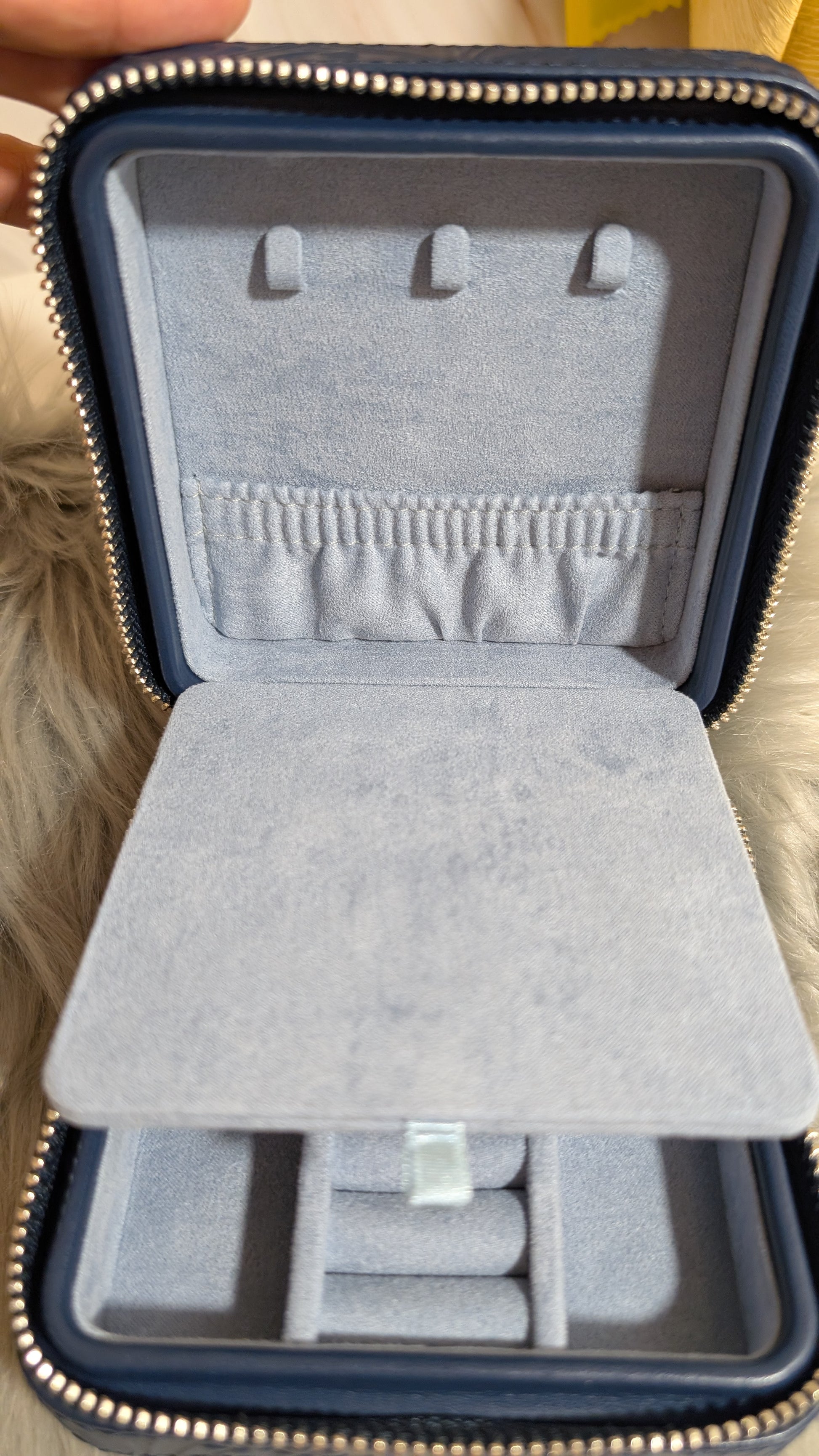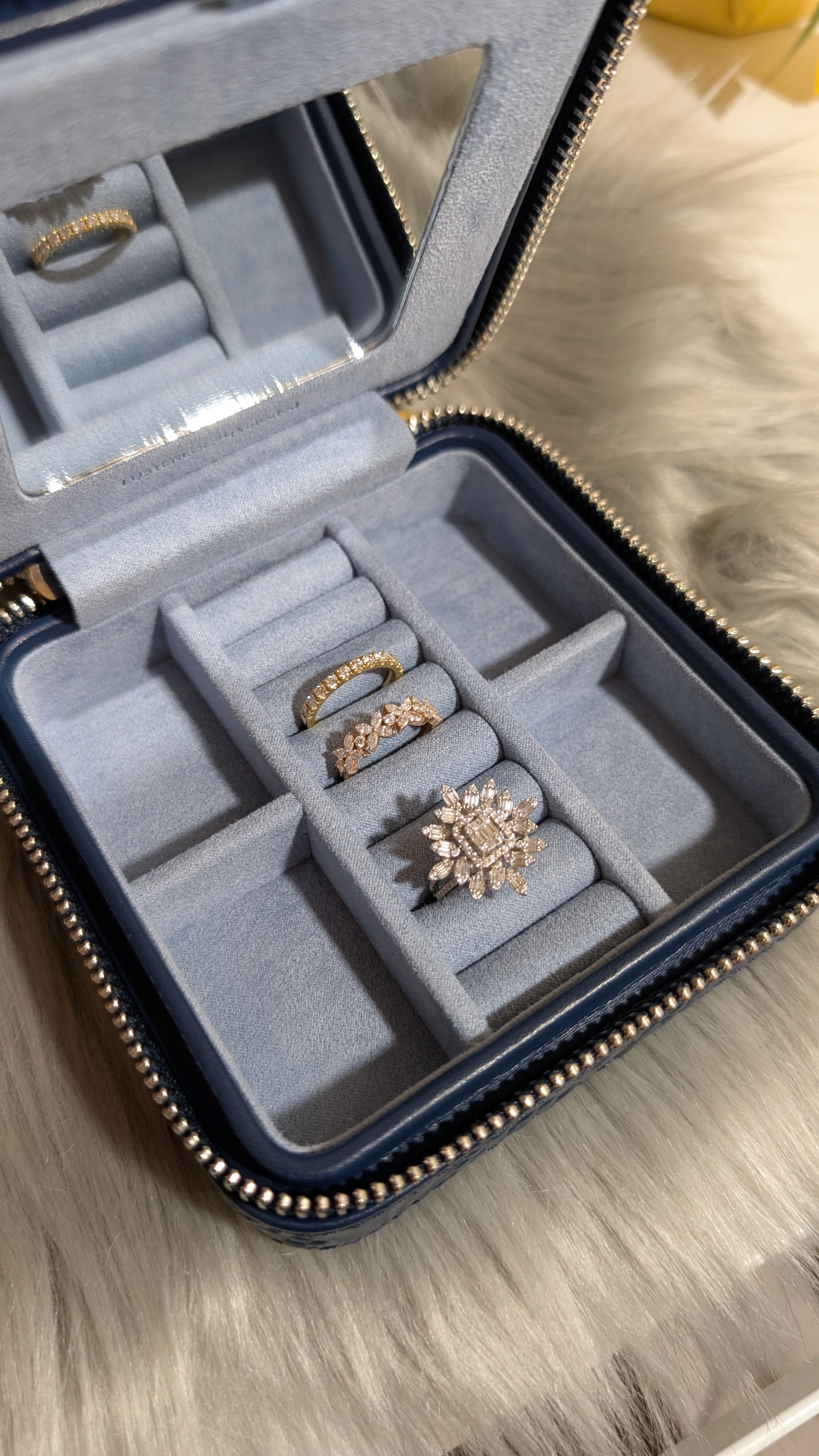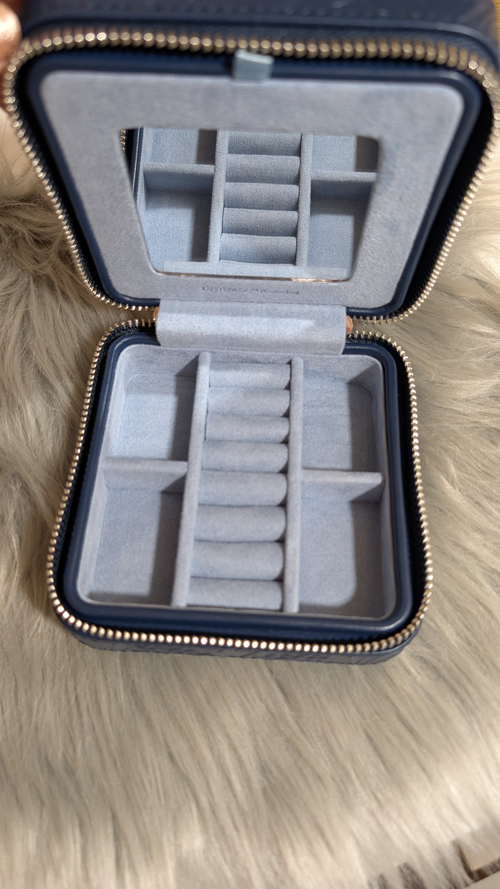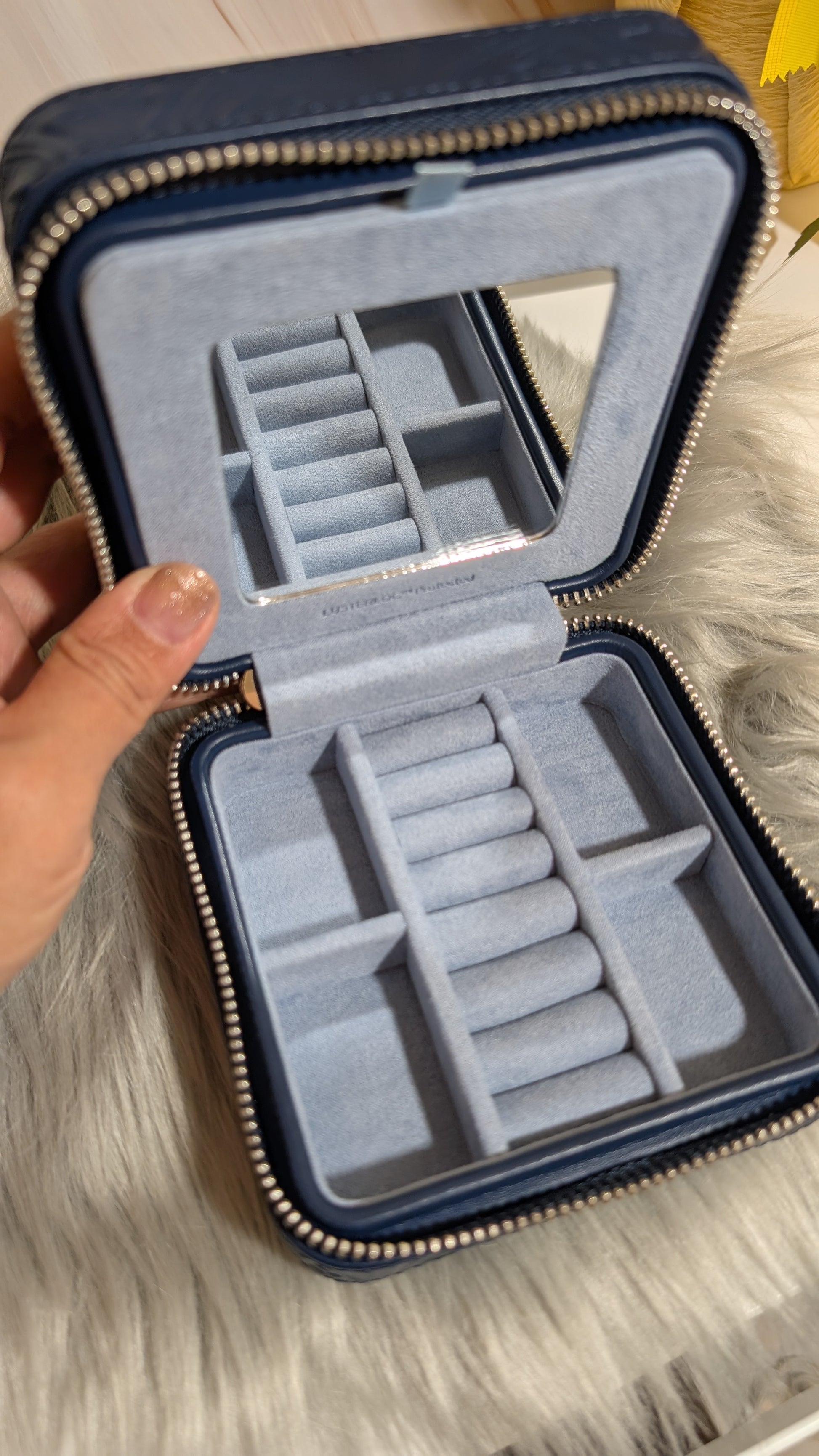 箱のデザイン自体は一般的なジュエリーボックスのデザインですが、非常にがっしりとした作りで、大事なジュエリーを旅先でもしっかりと守ります。
